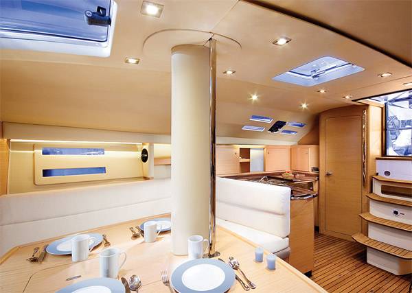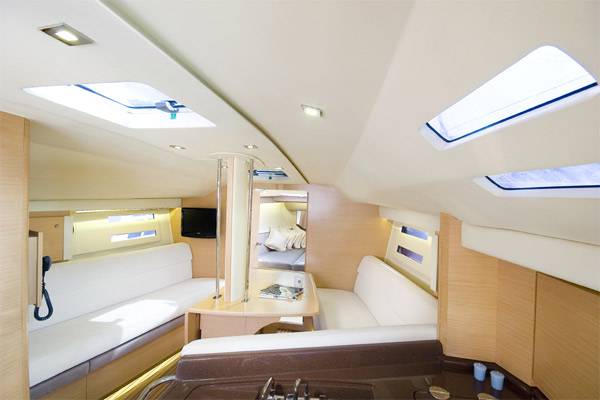 The advantages of the Azuree 40 's innovative hull shape become very obvious the moment you step on board: the large-volume interior offering more accommodation space than any other yacht of similar dimensions; the stability from the chined hull-form; the more powerful performance, to name just three benefits.