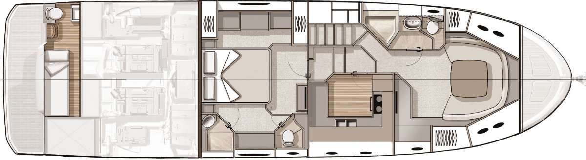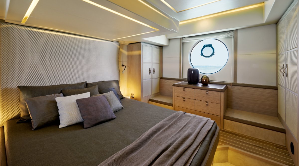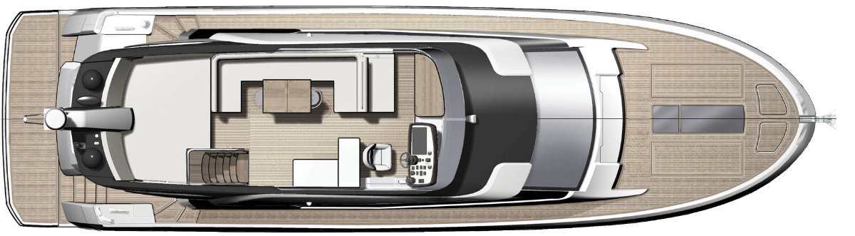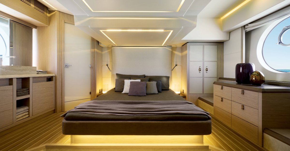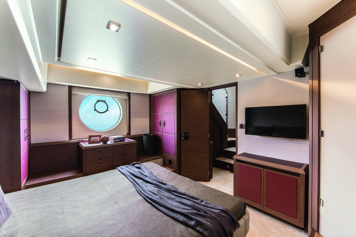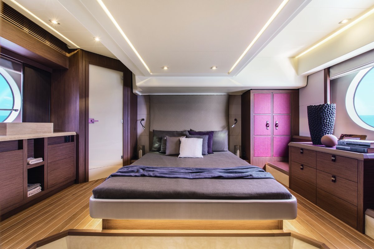 Stepping aboard the Monte Carlo 6 is effortless thanks to the hydraulic swim platform which can easily lower the optional Williams 325 Turbojet tender. Crew quarters nestle below the aft bulkhead which can also house a barbecue.