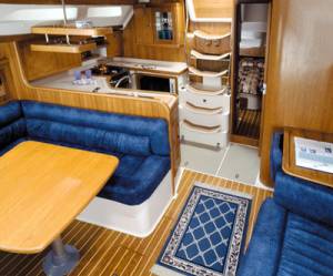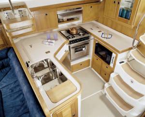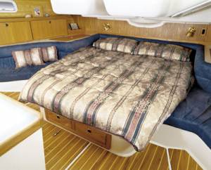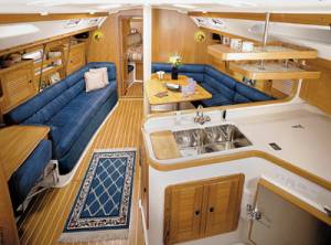 The Catalina 400 mark II boasts a new deck design. Under sail, the twin steering stations offer the helmsman perfect perspective. New and upgraded features for the 400 mark II include larger engine, steering and mechanical systems, upgraded interior finishes and detailing. The spacious owner's cabin has twin hanging lockers, abundant storage and centerline double berth. Varnished teak, ash, and coordinated fabrics compliment the custom countertops and durable textured overhead. The 400 is carefully engineered with fiberglass sub-sole structural grid and well planned electrical, mechanical and plumbing systems. The Catalina 400 is available in 2-cabin and 3-cabin configurations.