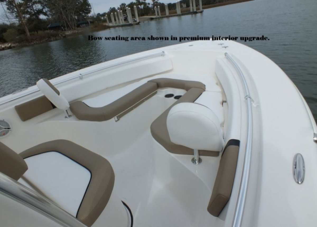 Sea Star hydraulic steering. Deluxe flip up bolster leaning post. Pull up cleats. Bilge pump with auto switch. Live well with high speed pick up pump. 9" x 12" built in trim tabs. Full bow cushion package including bolsters and removable backrests. Cockpit bolsters. Molded in swim platform with telescoping 3 step ladder. Recessed low profile bow rail. Molded in seat with cushion on front of the console. Closed cell positive foam flotation. Stainless steel trolling rod holders with integrated drains. Tinted windshield with SS grab rail. Bench seat cushion and backrest with cushion. Two Large Storage Boxes in Bow. Bilge Pump with Automatic Switch. Foam Injected Fiberglass Stringer System. Self-Bailing Cockpit. Ten (10) Year Hull Warranty. Recessed horizontal gunwale rod racks. Many more standard features.