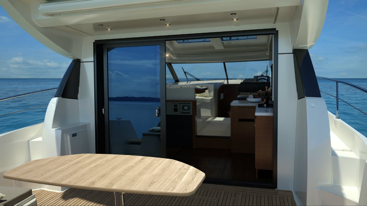 The 450 S has two large cabins, with two large bathrooms each with a separate shower are. The owner’s cabin, filled with light, has a separate entrance, unique in a 45’. The concept of the central kitchen, serving both the living room and the cockpit follow the Prestige concept already developed with success.