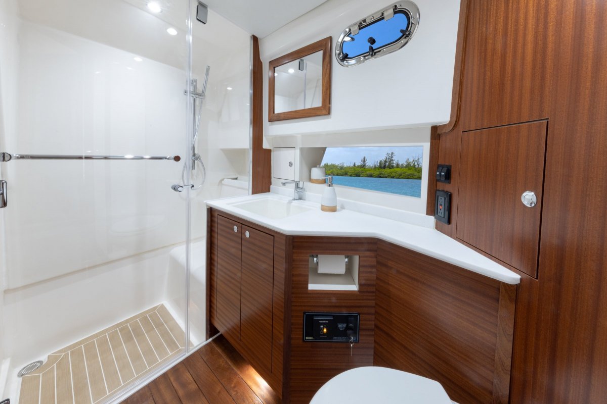 Not only is it the largest boat ever built by Pursuit, it is the ultimate in uncompromised perfection. Luxury exudes from every thoughtful design detail, maximizing the live-aboard yachting experience with expansive room for any whim--from dining to relaxing. Yacht-style bulwarks provide ease of passage from cockpit to foredeck, where you'll find a finely crafted entertaining and cabana space. The bridge deck is the real star, with its galley-up design that puts the chef in the middle of the action, surrounded by ample seating and luxurious amenities for everyone on board. Once you're in your favorite port, dual staterooms accommodate both you and your guests.