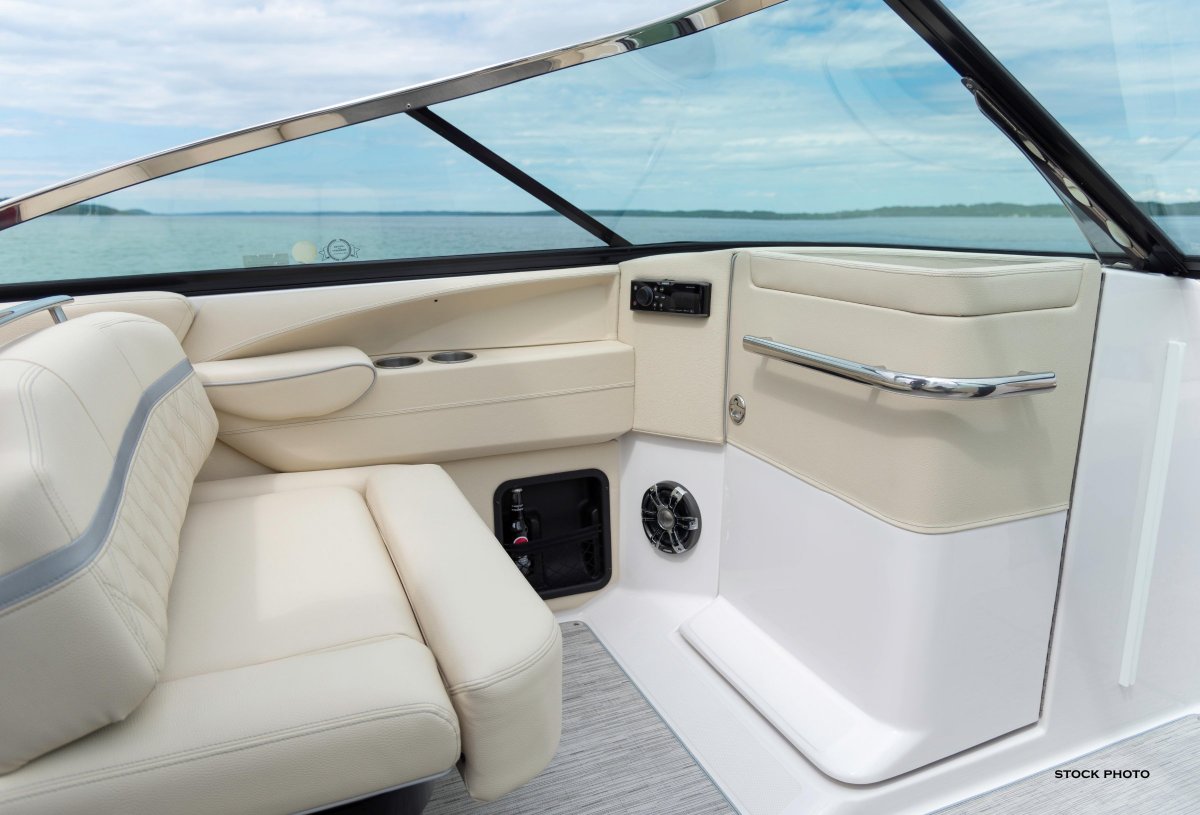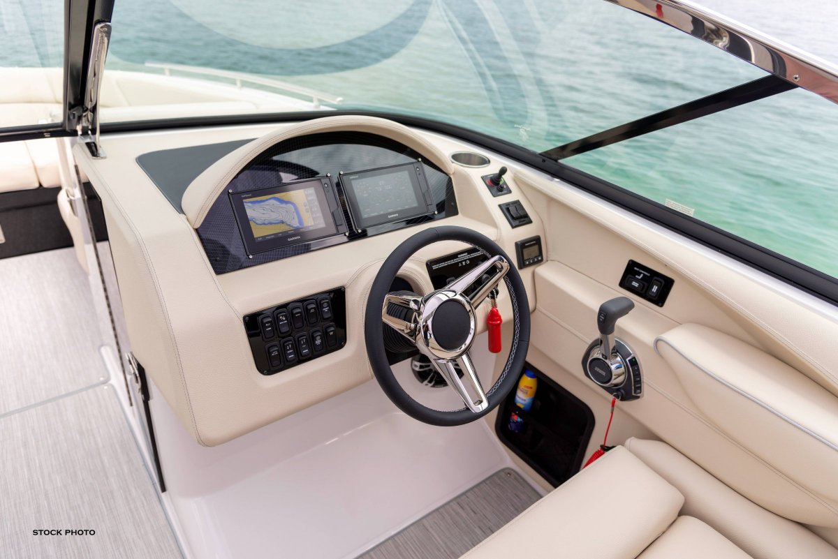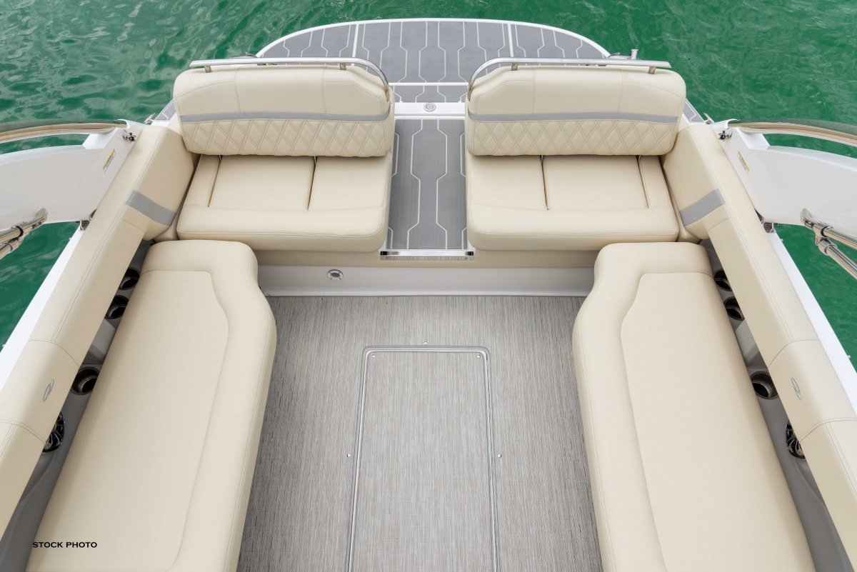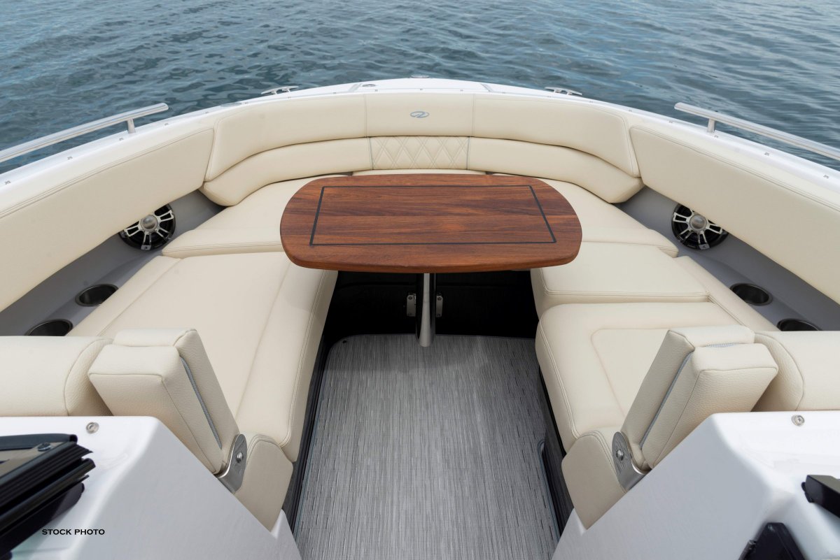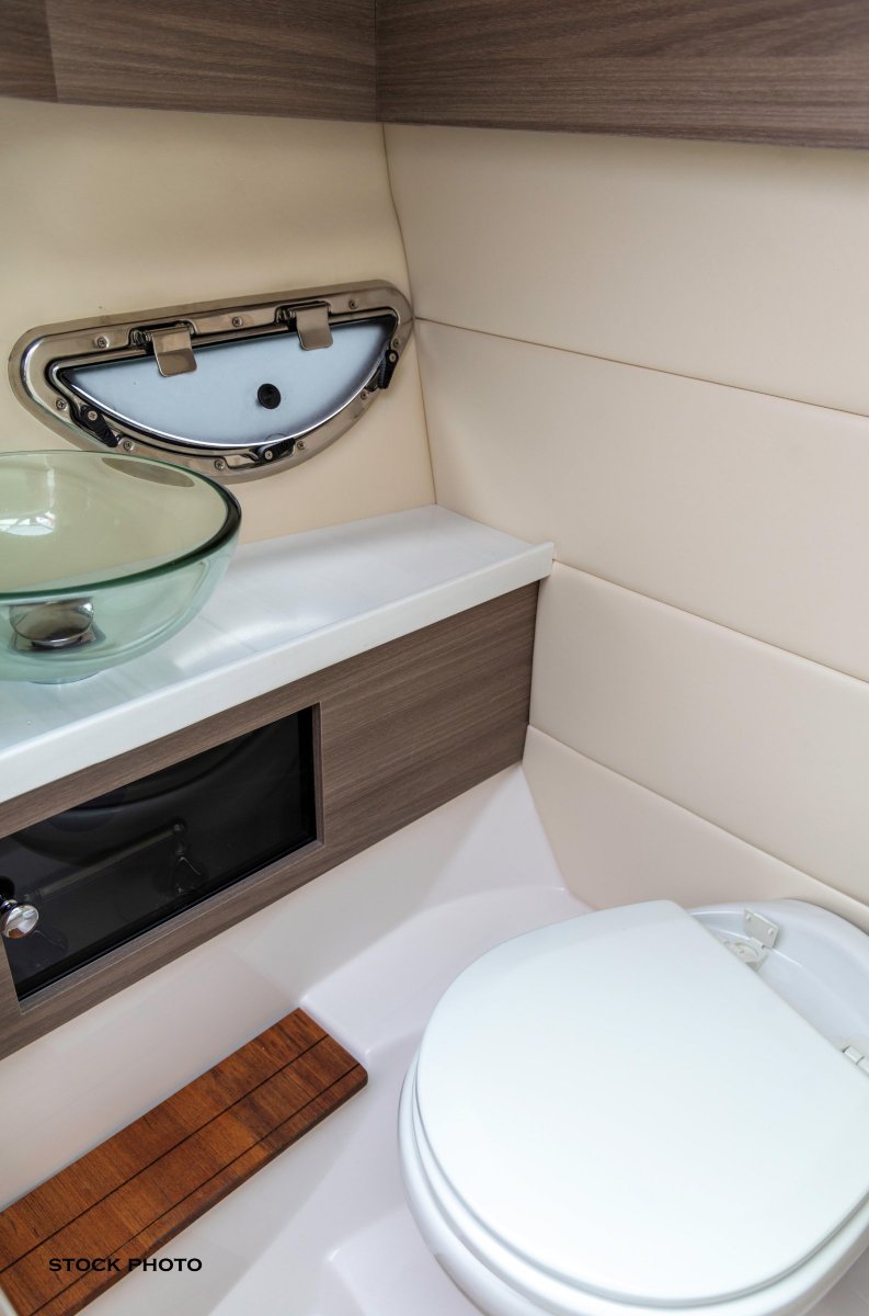 The expansive cockpit features multi-position backrests to provide the freedom to face forward or lounge aft and hand-wrapped, hand-stitched vinyl meets sleek metals to please the hand and eye. With the touch of a button, submerse the optional PowerPlatform underwater for easier water and boat entry. Likewise included is a well-crafted, upscale head with dark cherry cabinetry, vessel sink and incredible space for privacy and functionality.