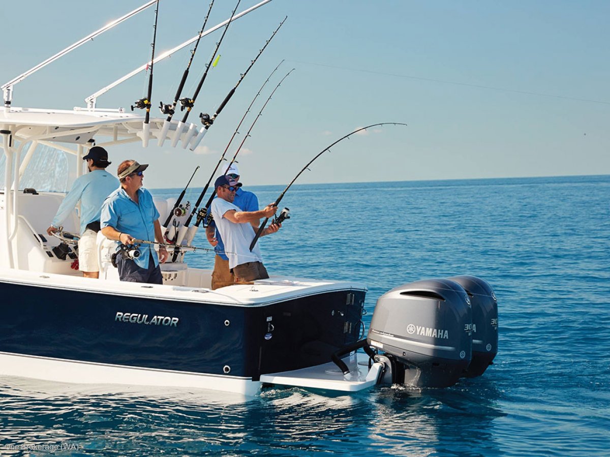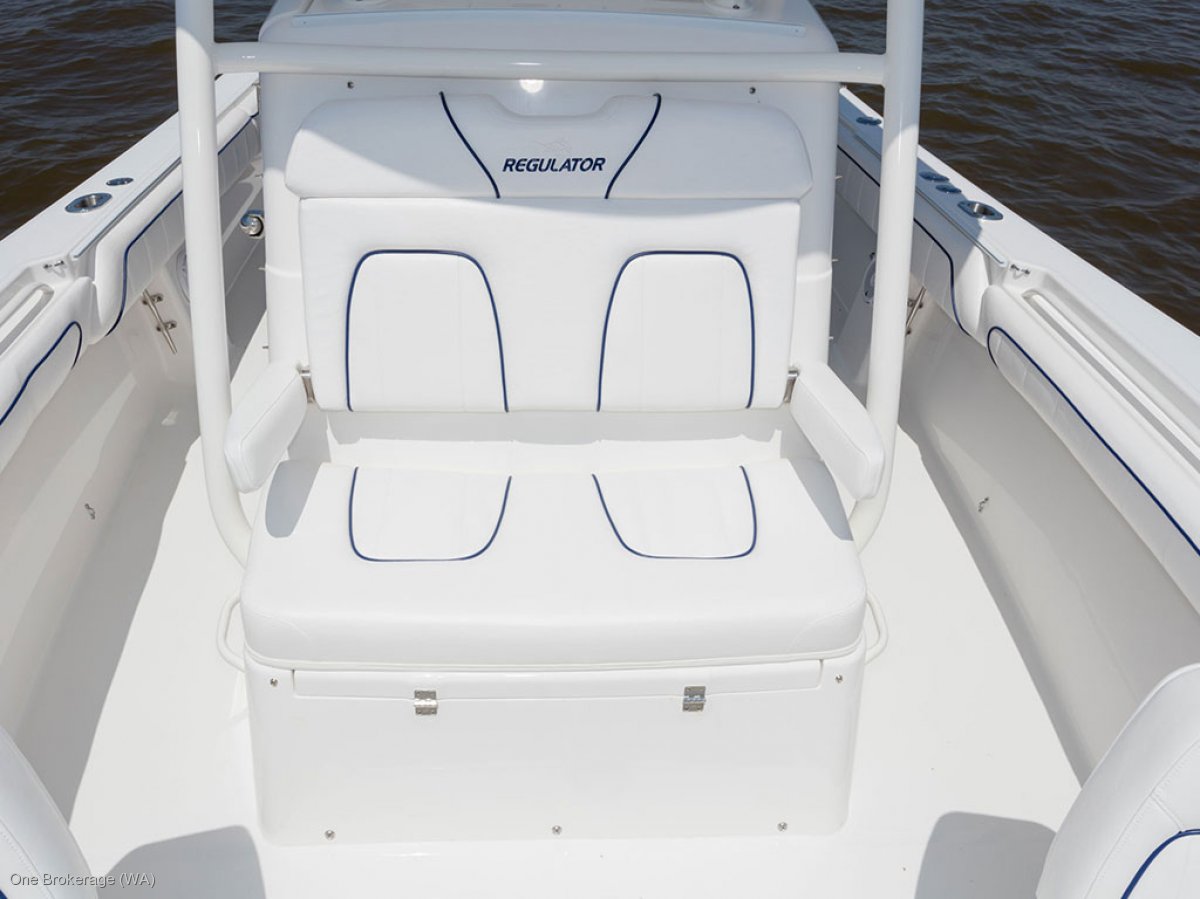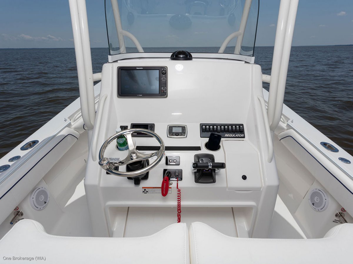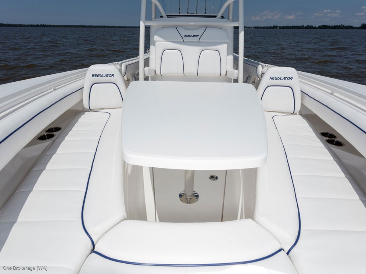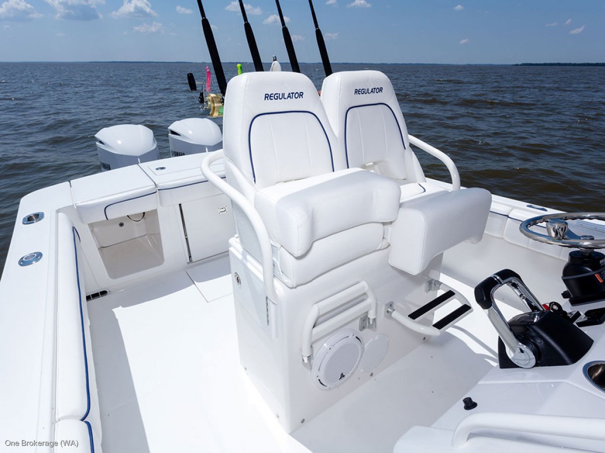 It's super fast, it fishes hard, and there is still plenty of room to entertain on the water. With its sharp bow entry and Lou Codega hull, Regulator's signature soft ride comes standard, and the new removable forward seat backrest option adds an extra degree of comfort. Seatback rod holders and optional t-top rocket launchers create an ideal rigging station for a group of anglers, putting all of your tackle within perfect reach. With the power of twin Yamaha F300s and optional Helm Master(TM), you won't believe where the 28 will take you.