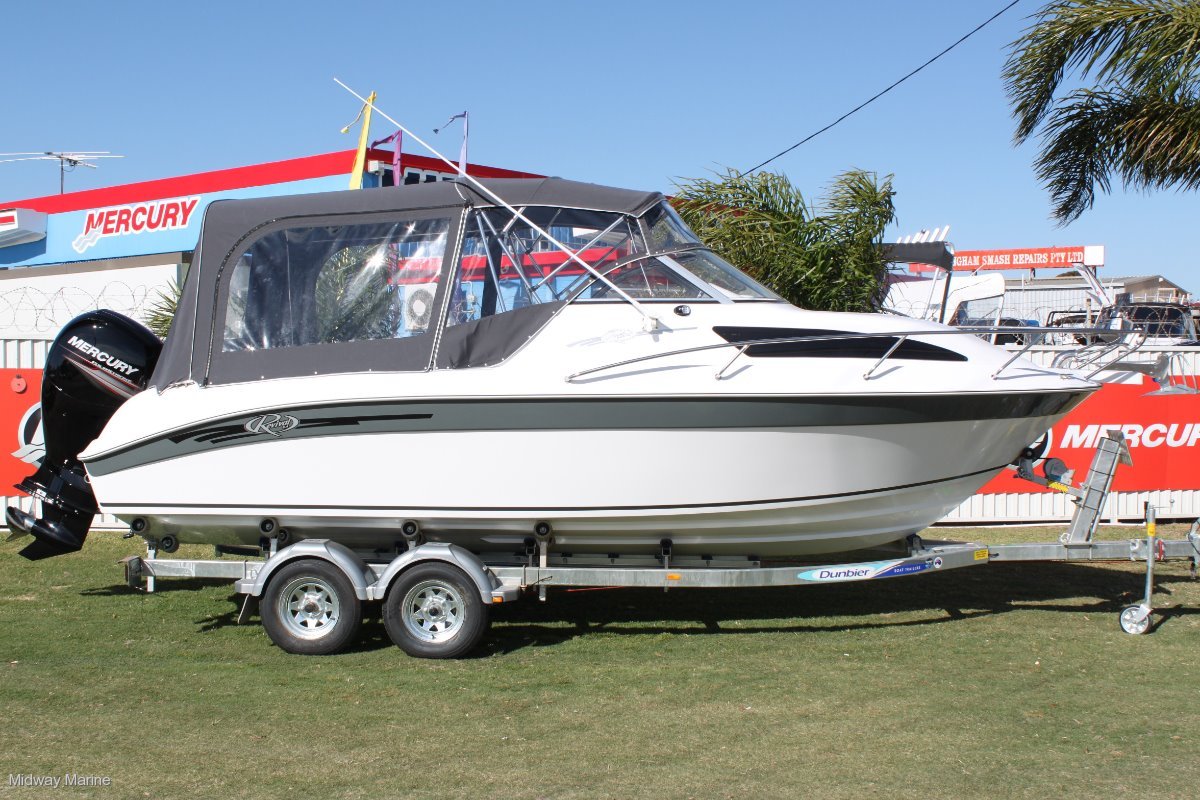 Perspex sides, windscreen grab rail, padded front side pockets, 3" padded vee berth with bunk infill, porta potty on strb side behind bulk head, toilet paper holder, storage under bunks, cabin roof lined and sides fully carpeted, large anchor hatch, walk around side decks, split bow rail, nav lights, rod holders, cleats, tow eyes, table, cabin curtain, s/s ladder