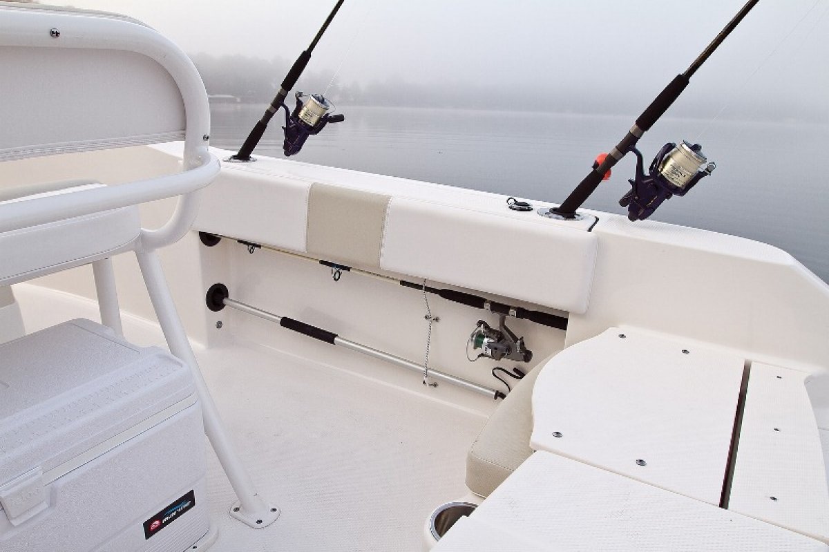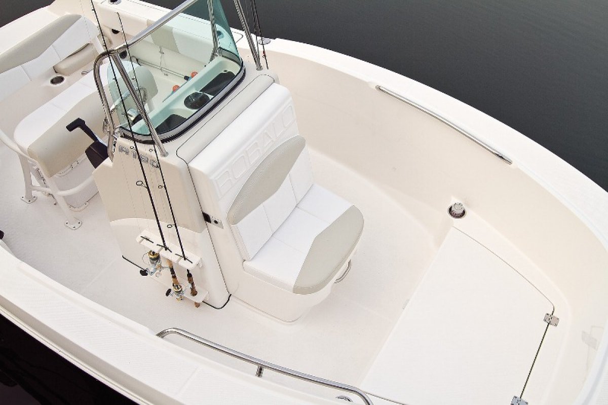 Robalo R180 Centre Console; the baby of the Robalo fleet, but still a serious offshore fishing rig; with a soft riding yet stable hull design that keeps you dry even in the biggest water, self draining decks, high freeboard, standard live bait tank, big kill tank, convertible casting platforms, rod storage, large portable esky and massive 189 litre fuel capacity. The lockable under helm storage can be optioned to include a porta pottie keeping your and your family out on the water for longer and Robalo’s famous factory fitted aluminium t-top would have to be at the top of your options list or maybe the ski tow frame for added family fun.