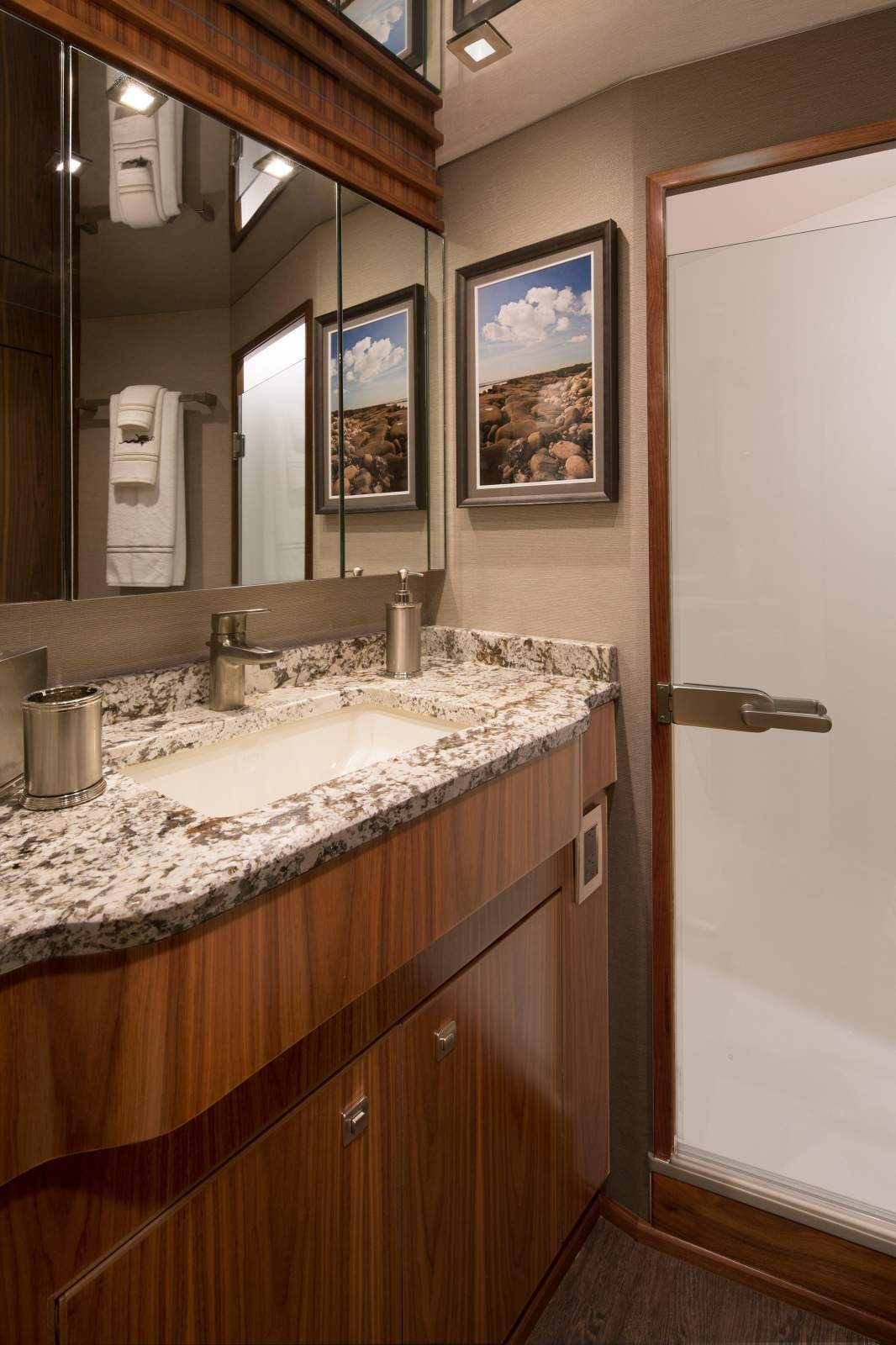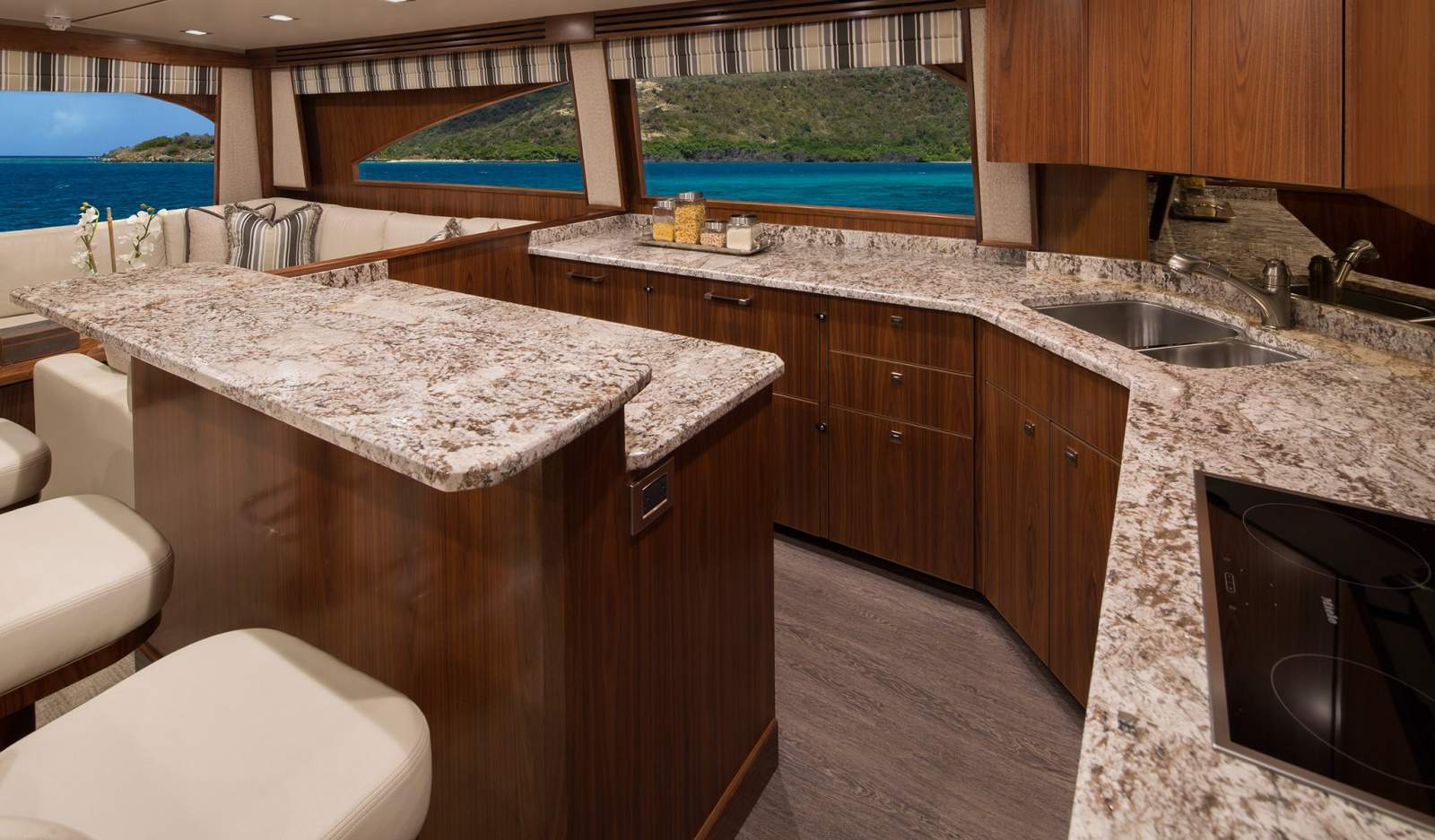- Large wrap around galley with refrigeration, freezer, stove top, sink and storage, custom galley granite, Level 1 countertop and three bar stools with overhang for bar stools