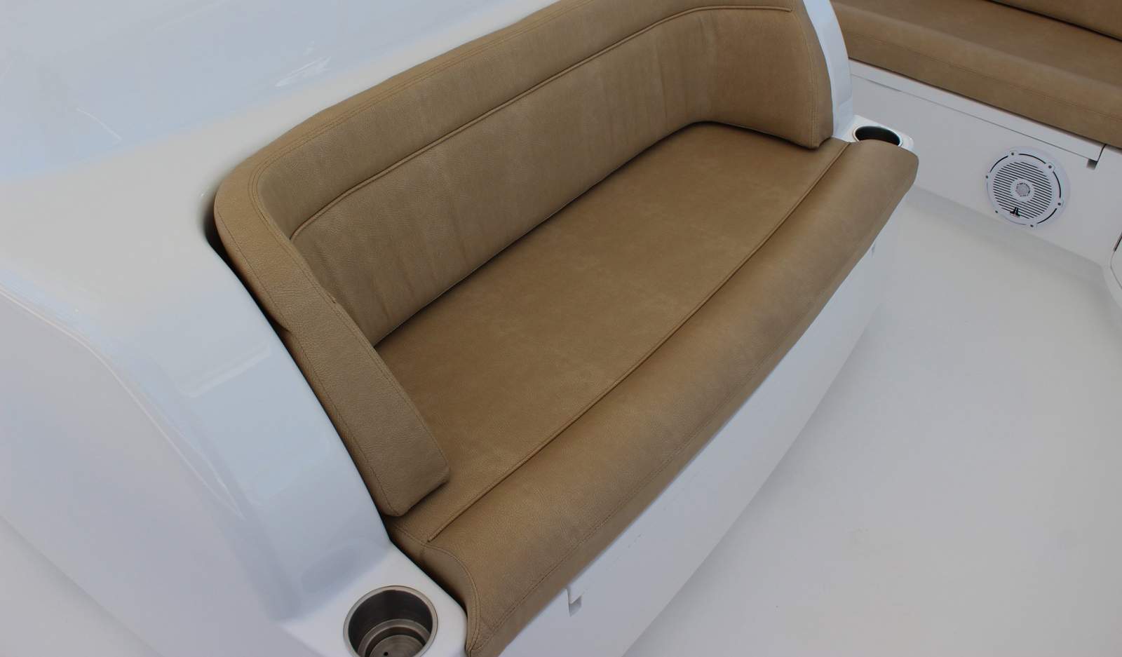- Dinette couch with removable cushions and storage underneath Dinette table, walnut, high gloss finish with 110V outlet at pedestal, thru-bolted