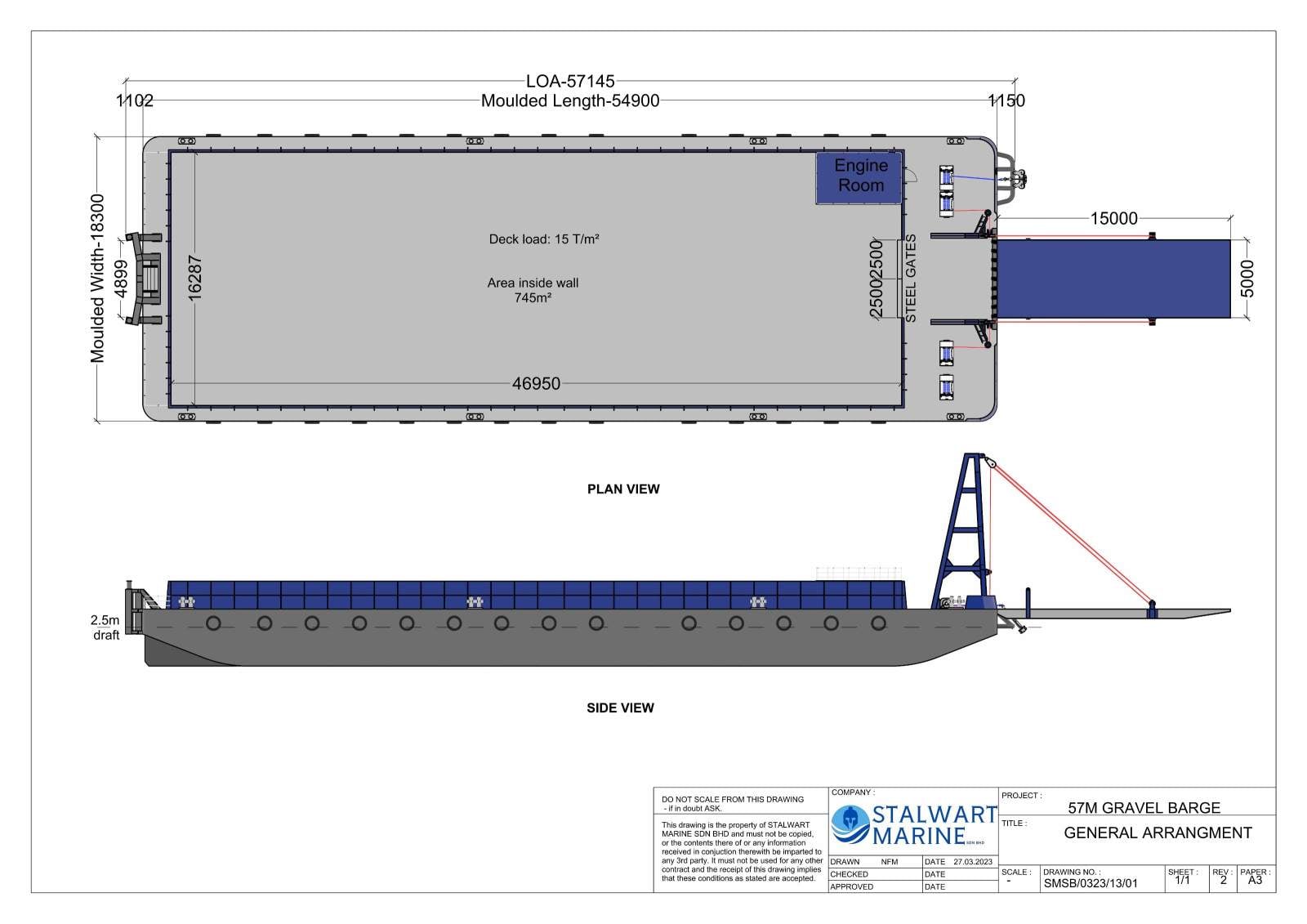 The 57M Gravel Barge by Stalwart Marine is purpose-built for bulk material transport operations.