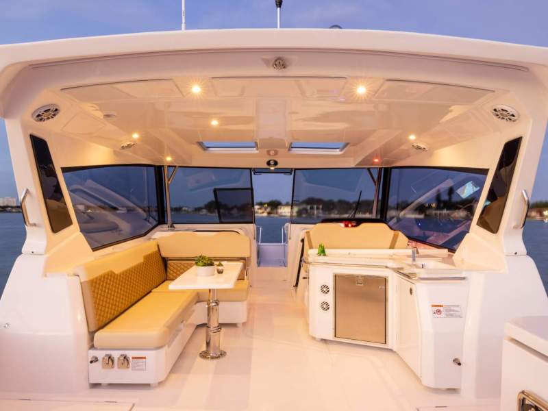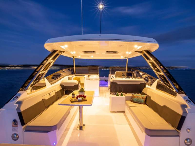 The spacious aft deck features an integrated tackle station for serious anglers, but transforms into an entertainment hub with the optional summer kitchen and BBQ setup. Pull-out coolers provide convenient storage while creating additional aft-facing seating for guests.