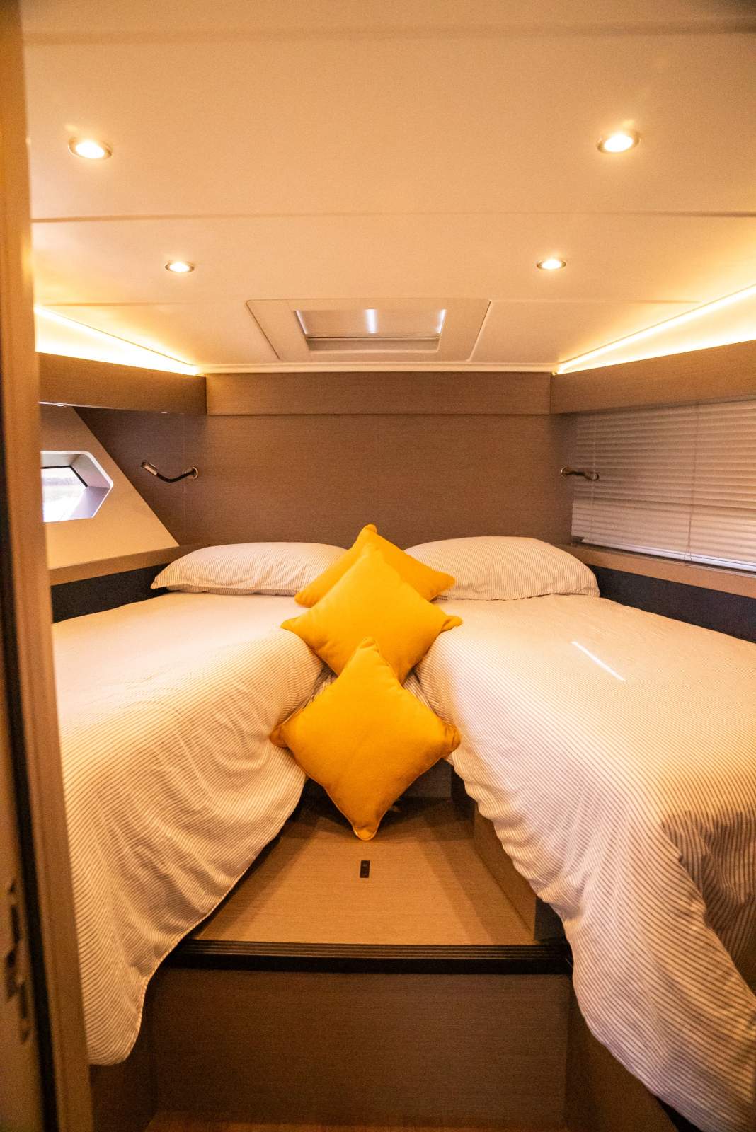With its large fridge-freezer, dishwasher and numerous storage areas the main saloon is perfectly equipped to ensure passengers exceptional on board comfort. As an option, the seating area can be replaced by a 3rd cabin with two single berths. Aft, there is a full-width owner's cabin with a private head with separate shower room. The large side windows ensure the cabin is bright and airy, enhancing the feeling of spaciousness. The VIP cabin in the bow area is fitted with scissor berths that guests can arrange as a double bed or two singles. This cabin also has access to the forward head and shower area, which can also be accessed via the saloon. The Gran Turismo 45 thus ensures that all guests can enjoy the very best amenities.