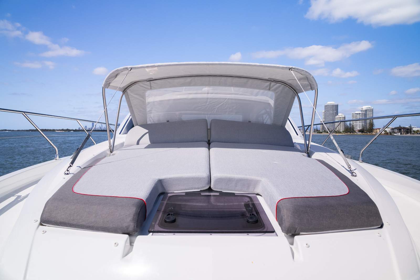 The BENETEAU Gran Turismo 45 makes no secret of its stellar leisure facilities. With its vast hydraulically-controlled bathing platform and the comfortable sun pad where two people can relax in style and take in the panoramic view, the GT 45 provides passengers with an exceptional indoor-outdoor environment. This is further enhanced by the sunroof in the new electric hard-top, a standard feature with an optional glass panel, that floods the interior with light. The foredeck houses a second, perfectly integrated sun pad with comfortable deck-level cushions. Several optional features include flip-up headrests, canopy/bimini and courtesy lights.