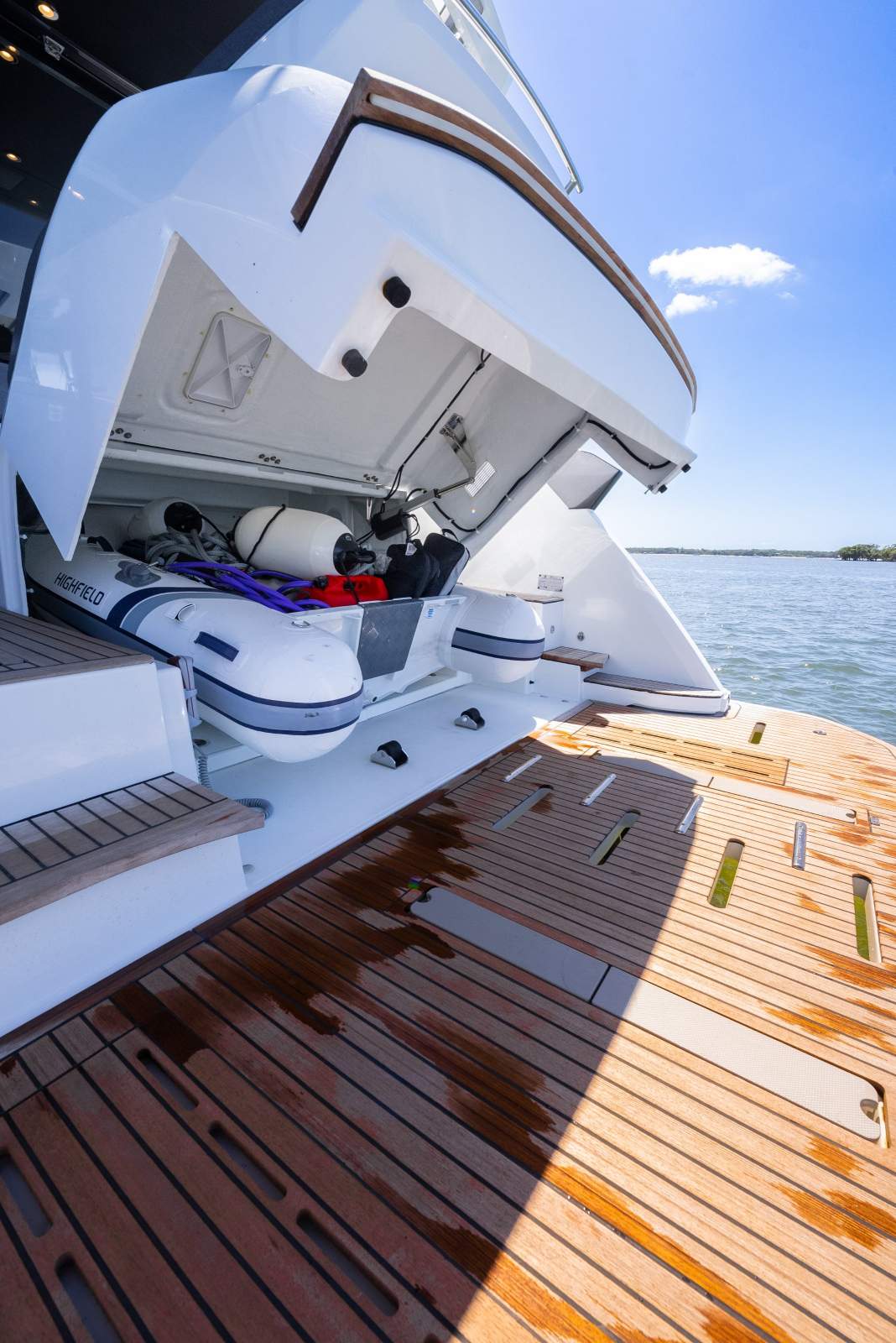 The modular design of the Gran Turismo 45 enhances both its functional aspects and its capacity to cushion passengers from the outside environment. The aft sun deck conceals an ingenious tender garage with electric door. The boat also includes an electric winch, making it easy to recover the tender back on board. This garage can also be used as storage space. Another clever functionality is the discreet electric grill housed in the extension of the sun deck, ideal for alfresco dining.