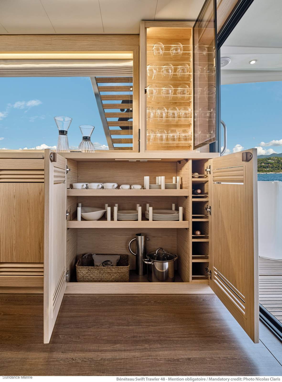 The expansive 20m² flybridge offers panoramic views and is designed as the ultimate social space, complete with helm station, seating, dining area and wet bar. Forward, the optional sunpad creates the perfect place to relax, while the spacious aft cockpit flows seamlessly into the saloon, creating a true indoor-outdoor living environment.