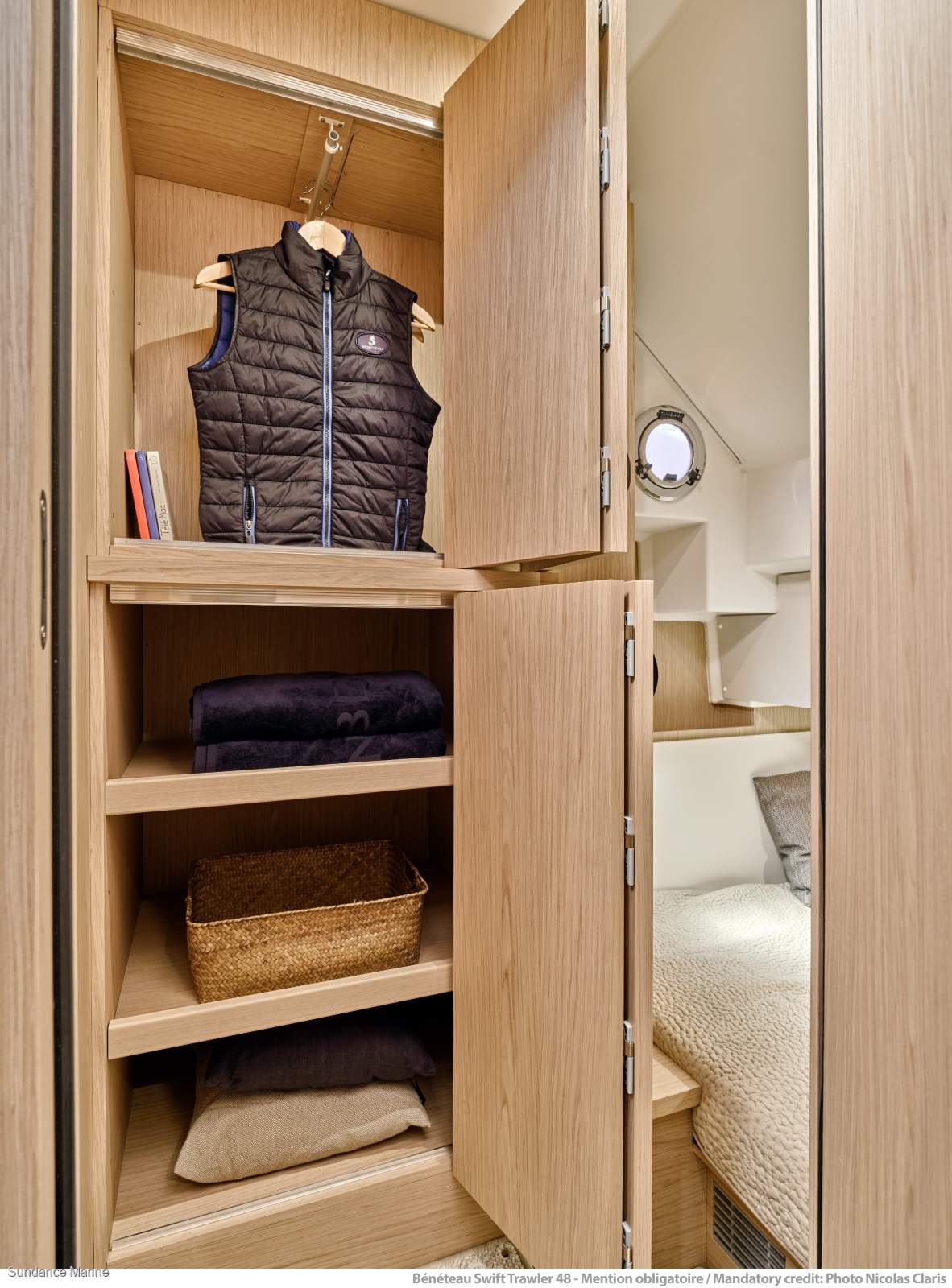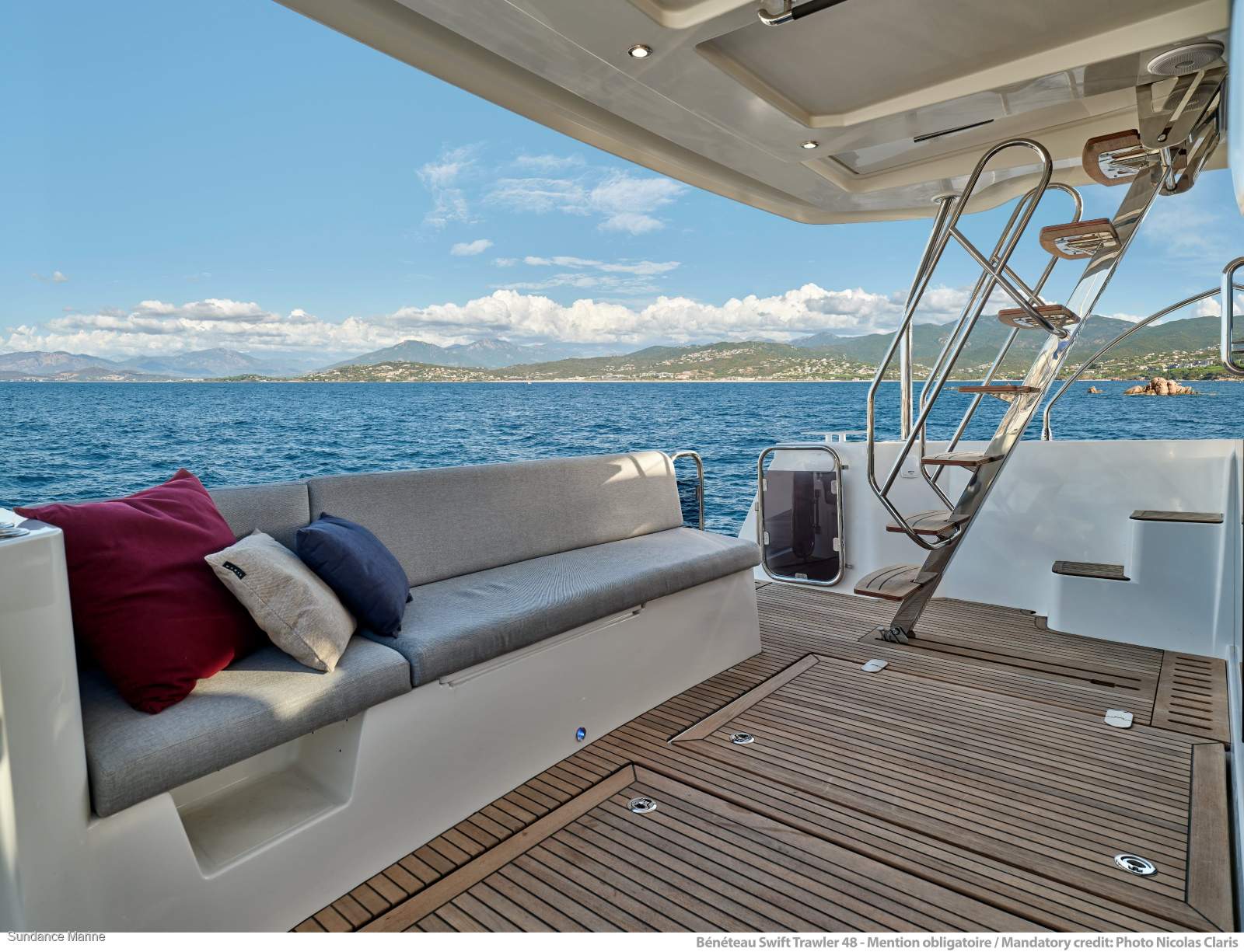 Inside, the Swift Trawler 48 features a bright and welcoming interior by Andreani Design, with a fully equipped L-shaped galley and a large raised dinette offering excellent visibility while underway. Below deck, the yacht offers three comfortable cabins and two bathrooms, including a generous owner's cabin forward, making it ideal for family cruising or entertaining guests.