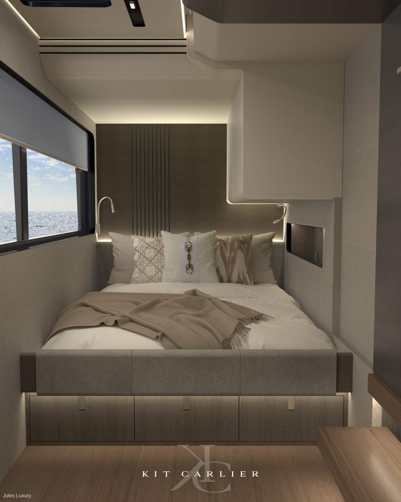 Full Beam Master cabin on bridge deck forward with super king bed lounge and ensuite starboard side VIP guest Cabin with queen bed and ensuite, port side double bunk room and ensuite