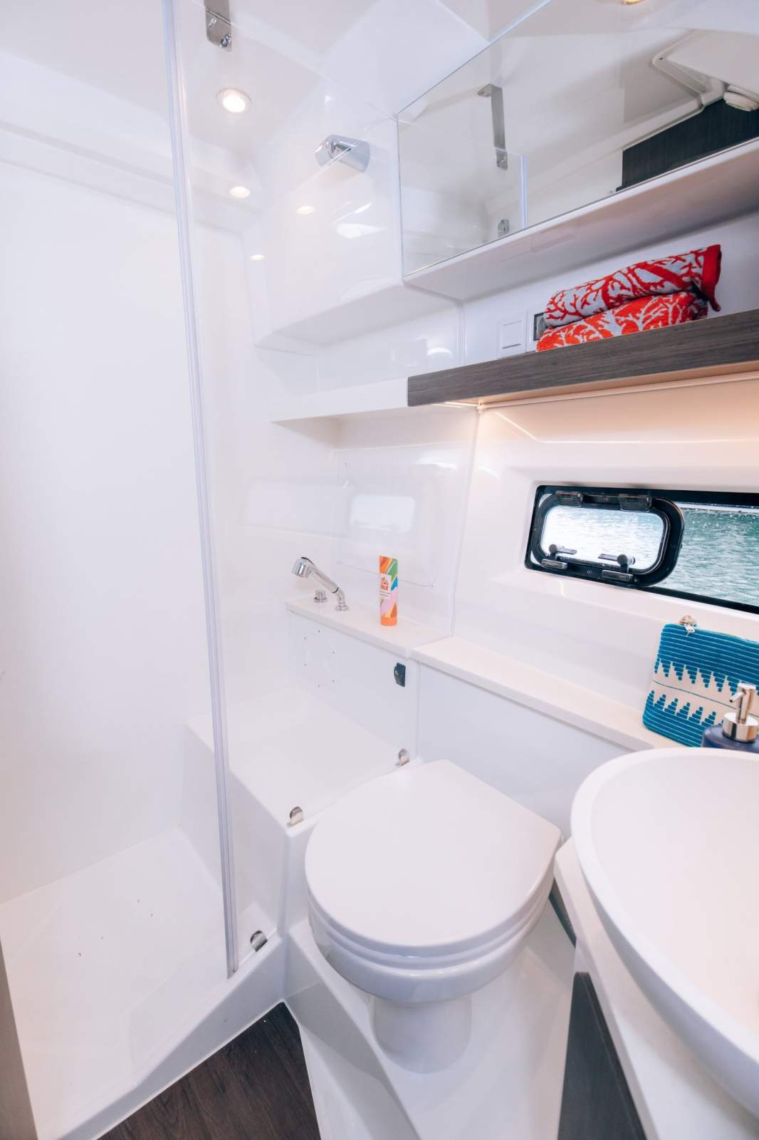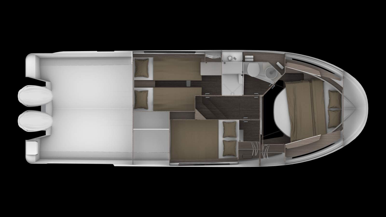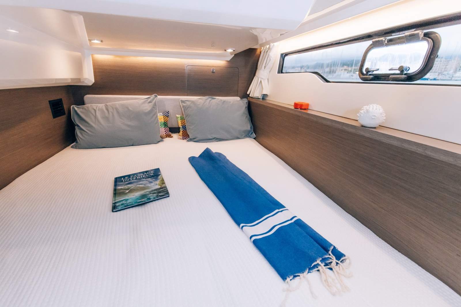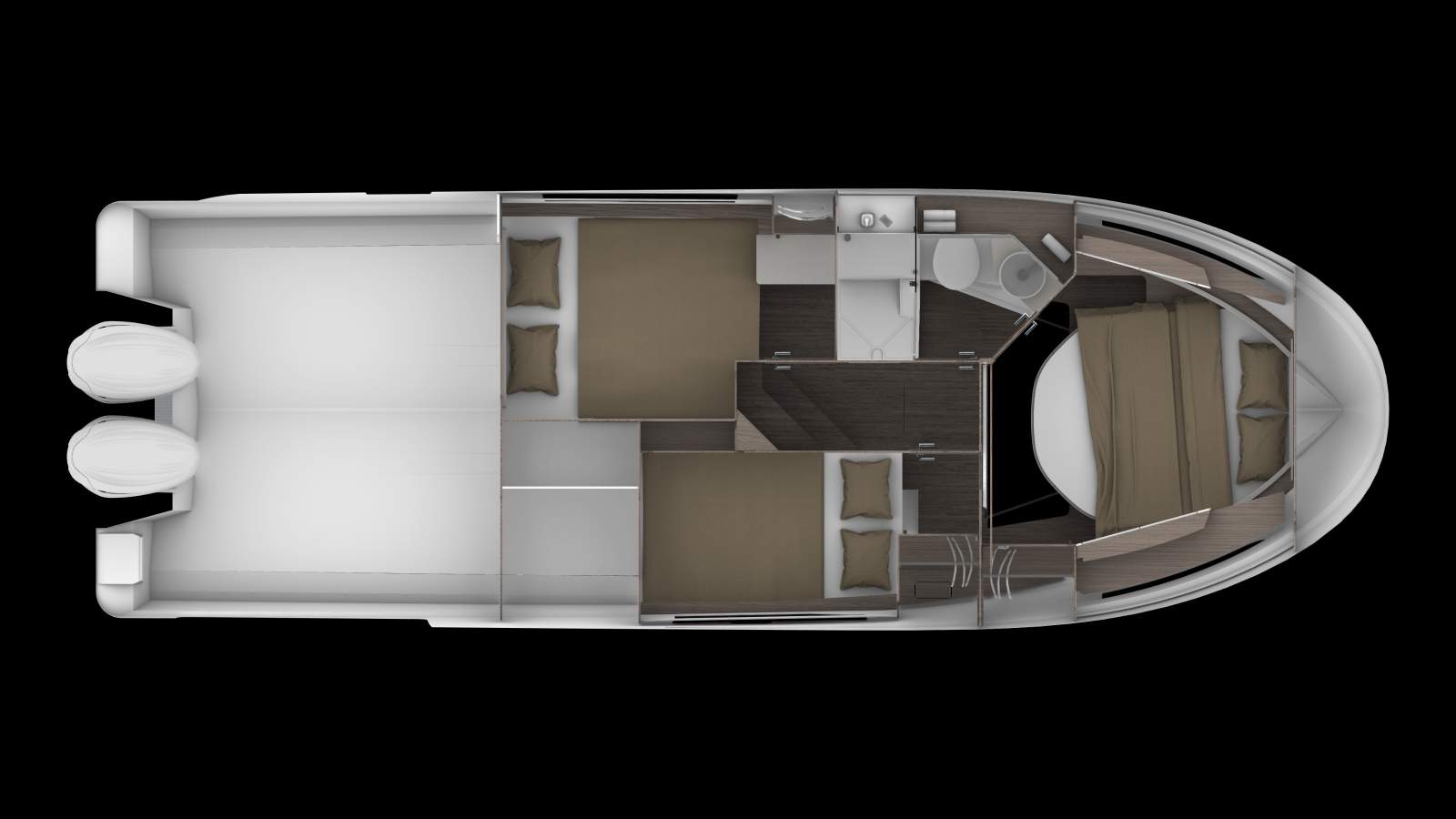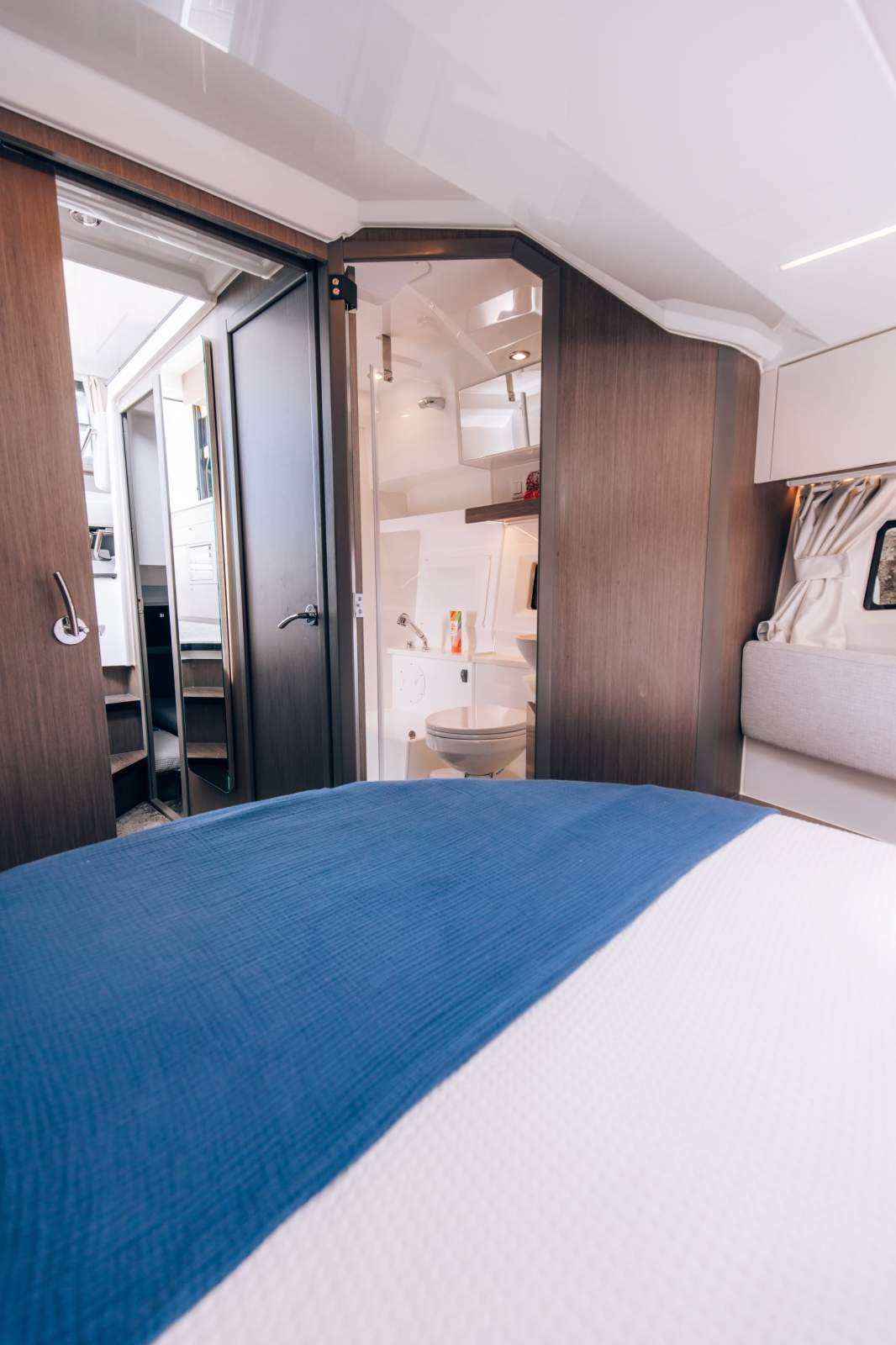 The long galley extends to the cockpit. The pilot seat, available in an optional rotating version, transforms the space into a true shared living area, with an integrated television adding a touch of contemporary elegance.