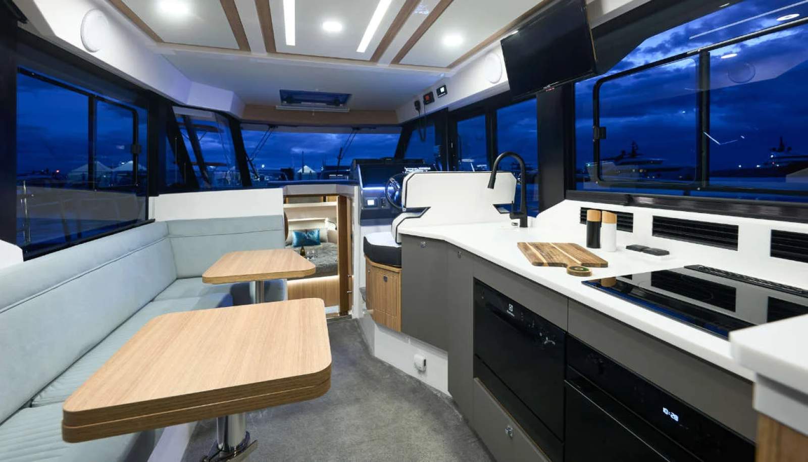 A flybridge configuration is available, adding a second outdoor living area with excellent visibility underway, while the cockpit is designed to be a genuine social zone at anchor or alongside.