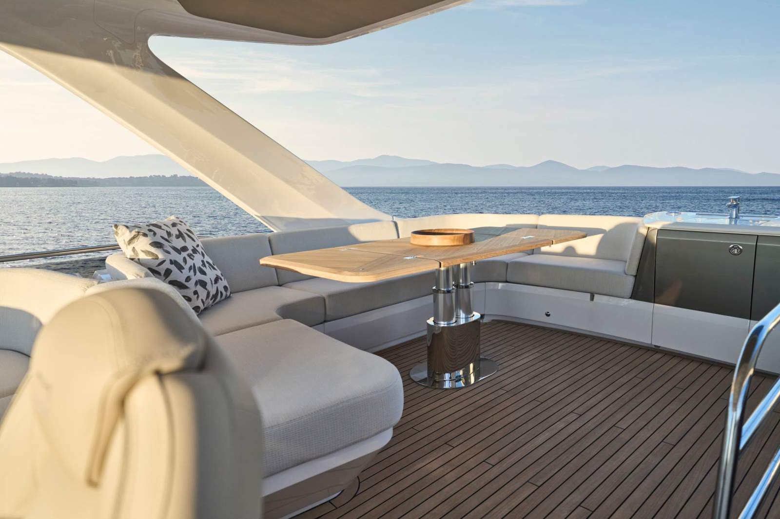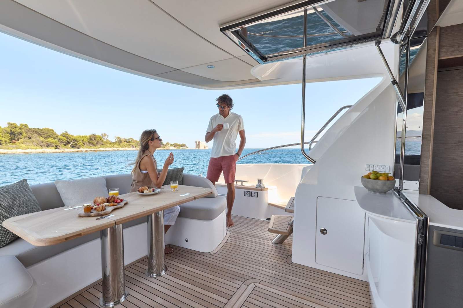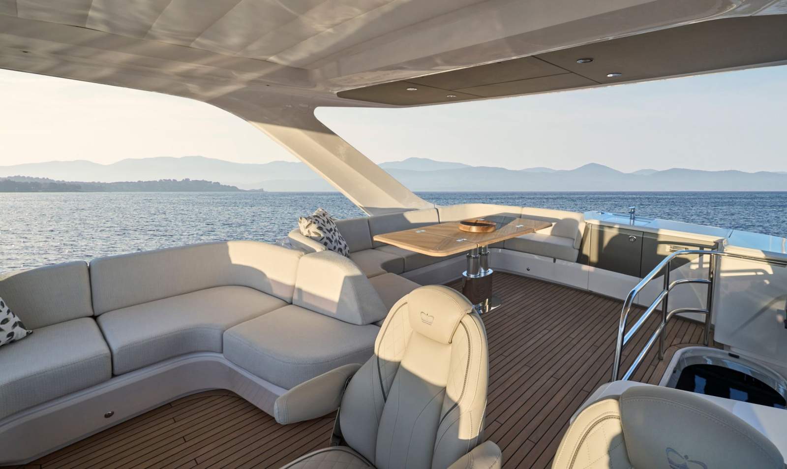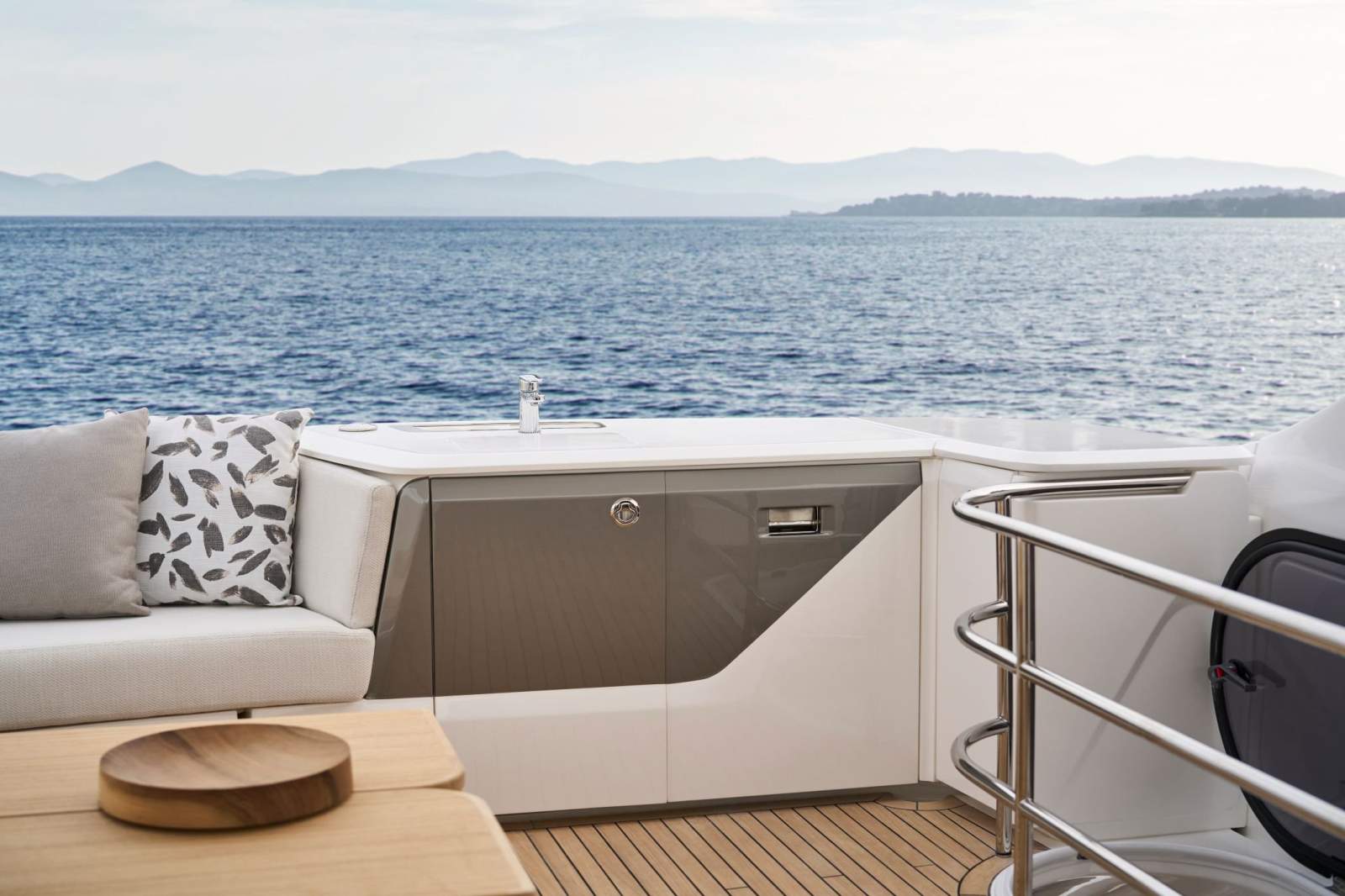 The expansive flybridge is a true standout, featuring a fully equipped wet bar, deep lounge seating, and a convertible sun pad - the ultimate space for alfresco living and socializing. Below, the aft cockpit connects seamlessly with the main saloon through sliding glass doors, offering shaded dining and open vistas. Wide side decks and integrated foredeck seating with a sunbed create multiple areas for relaxation under the sun.