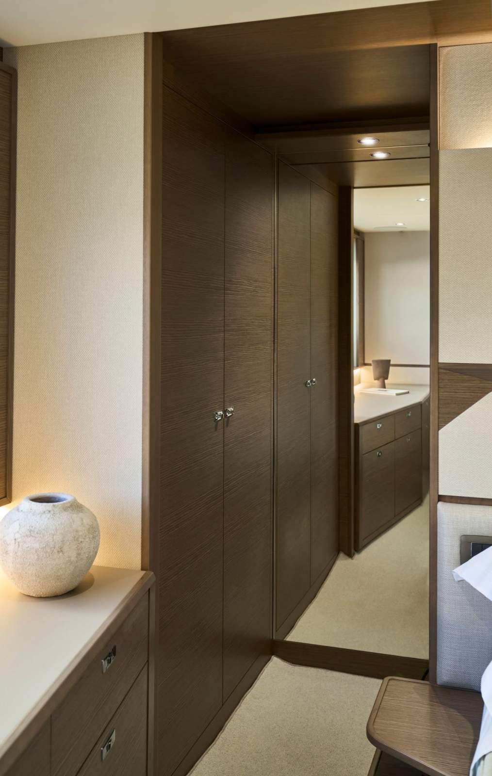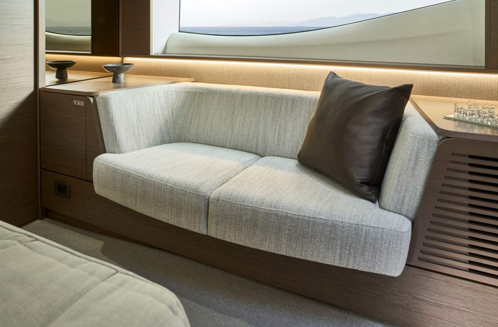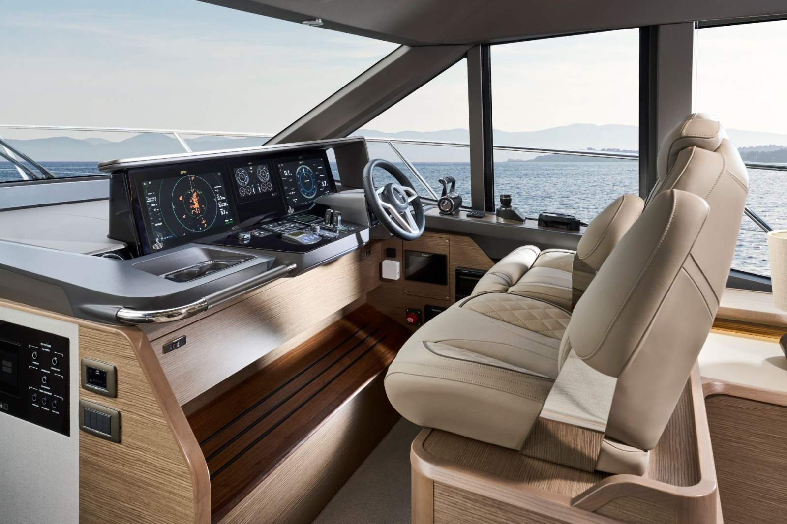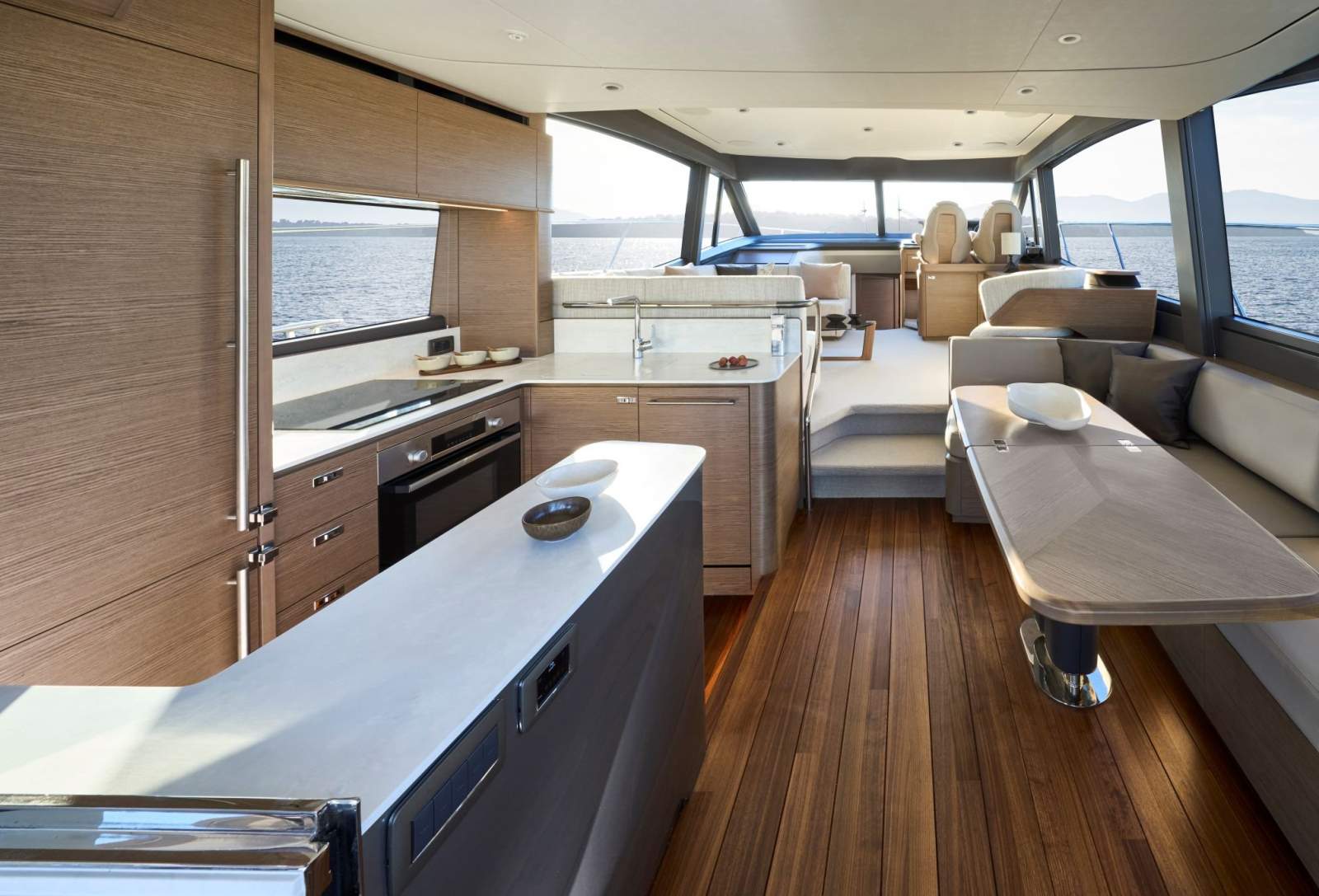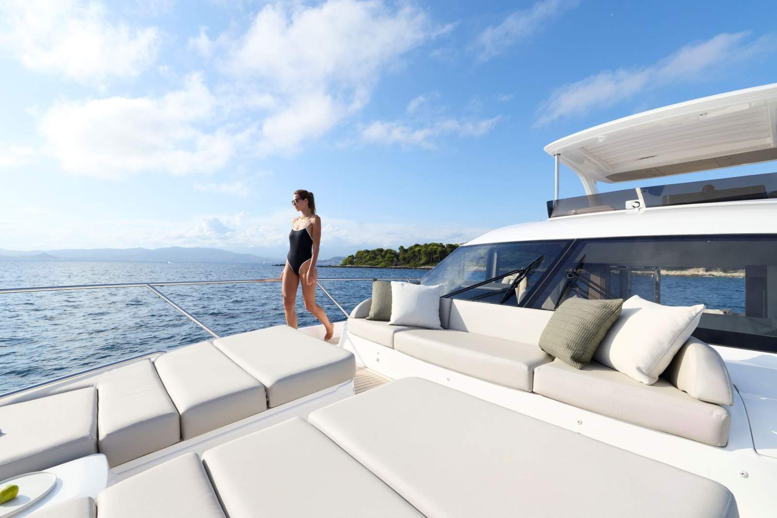 The expansive flybridge is a true standout, featuring a fully equipped wet bar, deep lounge seating, and a convertible sun pad - the ultimate space for alfresco living and socializing. Below, the aft cockpit connects seamlessly with the main saloon through sliding glass doors, offering shaded dining and open vistas. Wide side decks and integrated foredeck seating with a sunbed create multiple areas for relaxation under the sun.