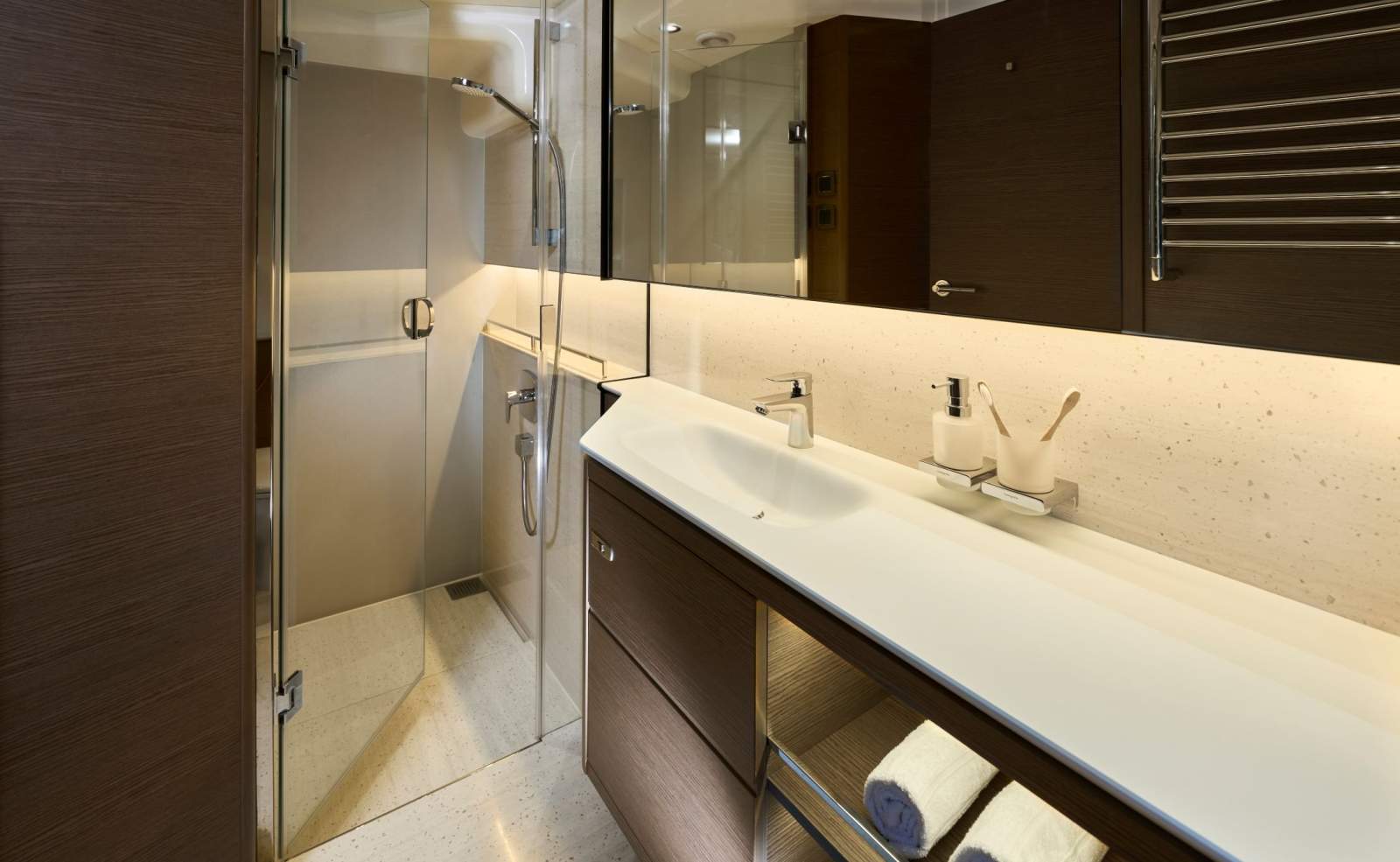 The F58 comfortably sleeps six guests across three beautifully appointed cabins. The full-beam master stateroom features panoramic hull windows, a private ensuite, and generous wardrobe space. A forward VIP cabin and twin guest cabin - each with their own access to a second bathroom - provide luxury and privacy for family or guests.