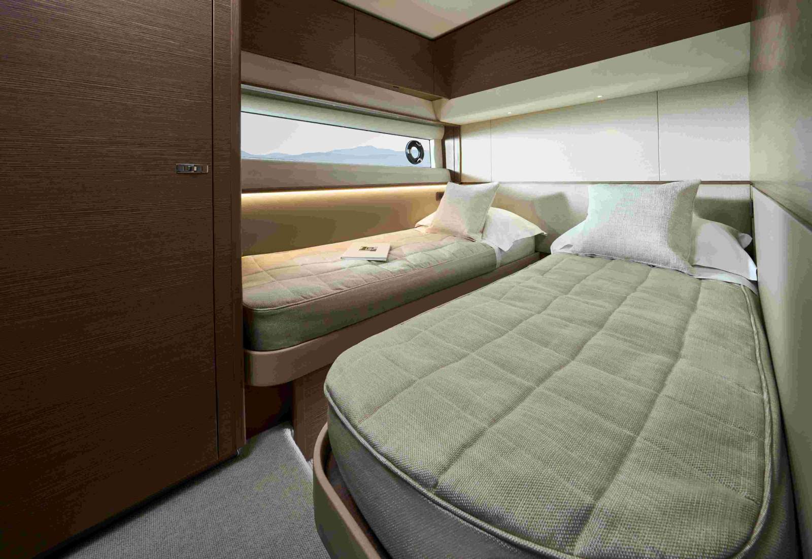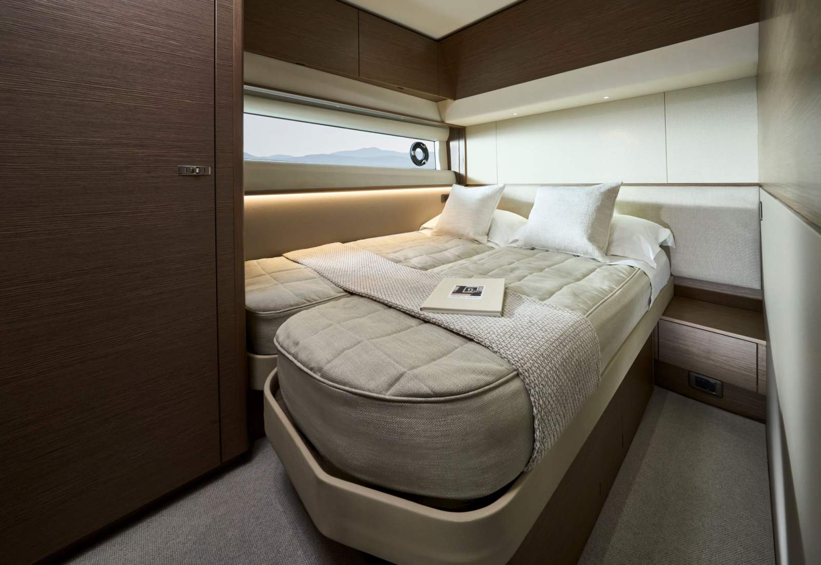 Below deck, the F58 comfortably sleeps six guests across three beautifully appointed cabins. The full-beam master stateroom features panoramic hull windows, a private ensuite, and generous wardrobe space. A forward VIP cabin and twin guest cabin - each with their own access to a second bathroom - provide luxury and privacy for family or guests.