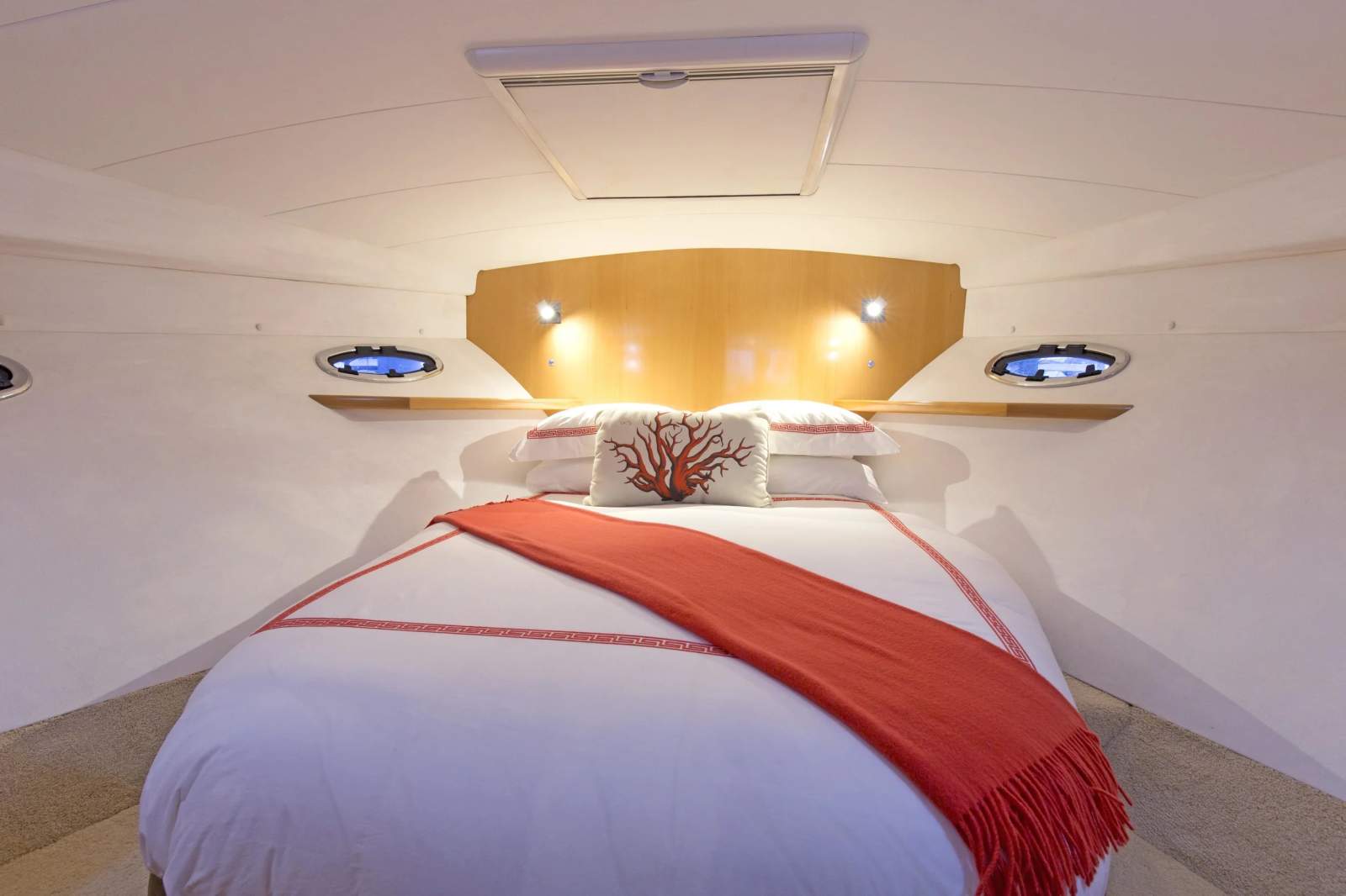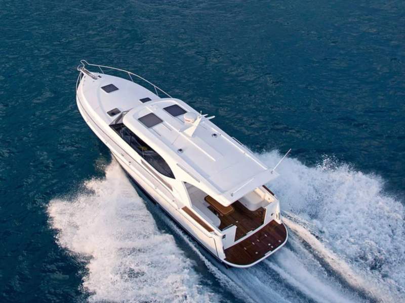 Entertaining flows easily from inside to out. This superb design includes an al fresco cockpit dining area, day heads in the cockpit to starboard and a servery area to port with the option of an additional fridge or a washer/dryer. There is plenty of storage space in the cockpit and the boarding platform has live bait tanks to cater for those who are keen on fishing.