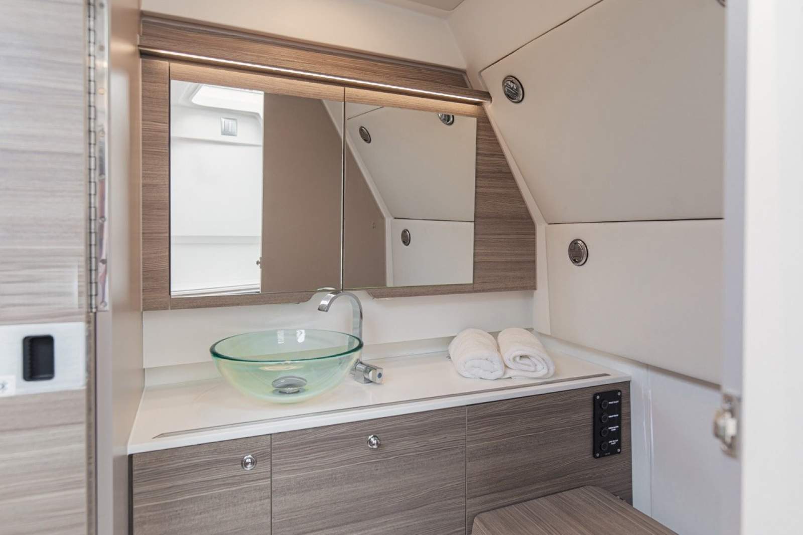 The ergonomically designed helm station features twin Simrad displays, offering intuitive navigation and full control over the boat's systems. It enhances the boating experience, making it user-friendly and efficient for both seasoned captains and beginners.