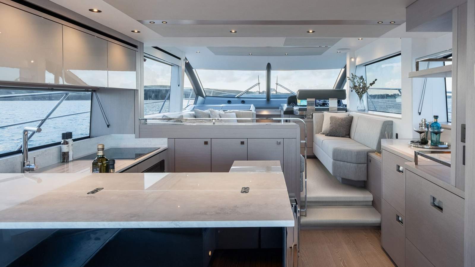 The interior has been transformed through the latest Sunseeker Interiors Collection, created in collaboration with Design Unlimited. Inspired by modern apartment living, the design embraces minimalist forms, warm natural finishes and tactile textures, replacing traditional yacht styling with a calm, contemporary aesthetic that feels refined yet welcoming.