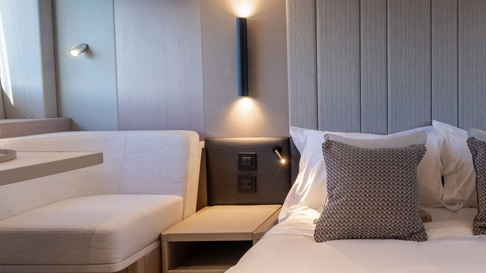 The main-deck galley is thoughtfully positioned to maximise space below, allowing for three well-proportioned cabins. The full-beam master cabin is exceptional for a yacht of this size, offering full-height headroom around a curved king-size bed. To starboard, owners can tailor the space with a chaise lounge, breakfast table or additional storage, while the en suite features recessed lighting, carefully detailed fittings and generous stowage. Throughout the interior, social spaces flow seamlessly, balancing comfort, practicality and understated luxury in equal measure.