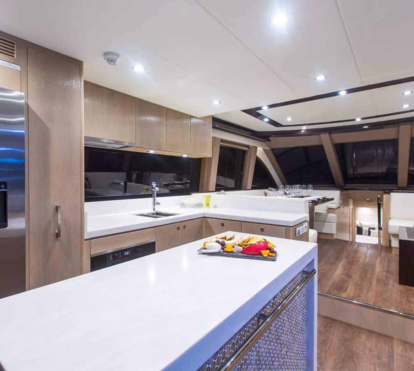 While every vessel is fully customised to each owner, all offer an impressive full-beam Master Stateroom, ample bed and bath arrangements for guests and social spaces that allow maximum usage of this large volume vessel.