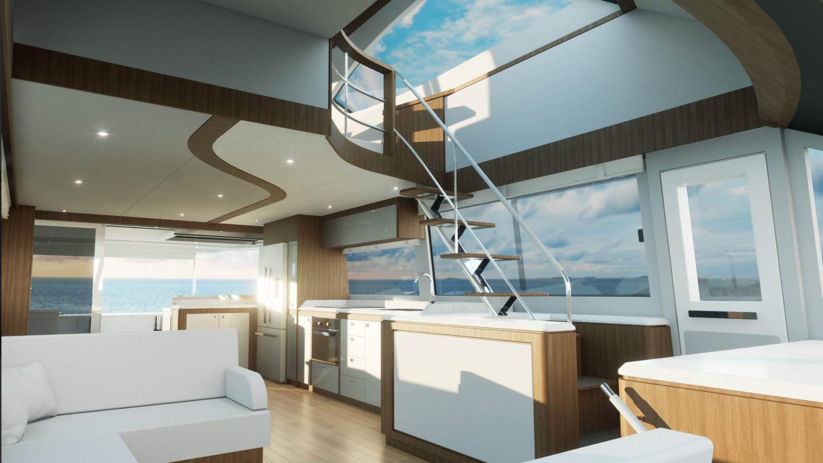 The 7000 Flybridge features the innovative Whitehaven Atrium, connecting the flybridge, saloon, and lower levels through a stunning three-storey New York loft-style layout. Available with either forward or aft flybridge staircases, the flybridge has been designed as an additional living and socialising space, complete with a lounge and a pleasant aft deck with seating. An angler's or sun lover's delight, from here you can see for miles and enjoy the ambiance a flybridge model provides.