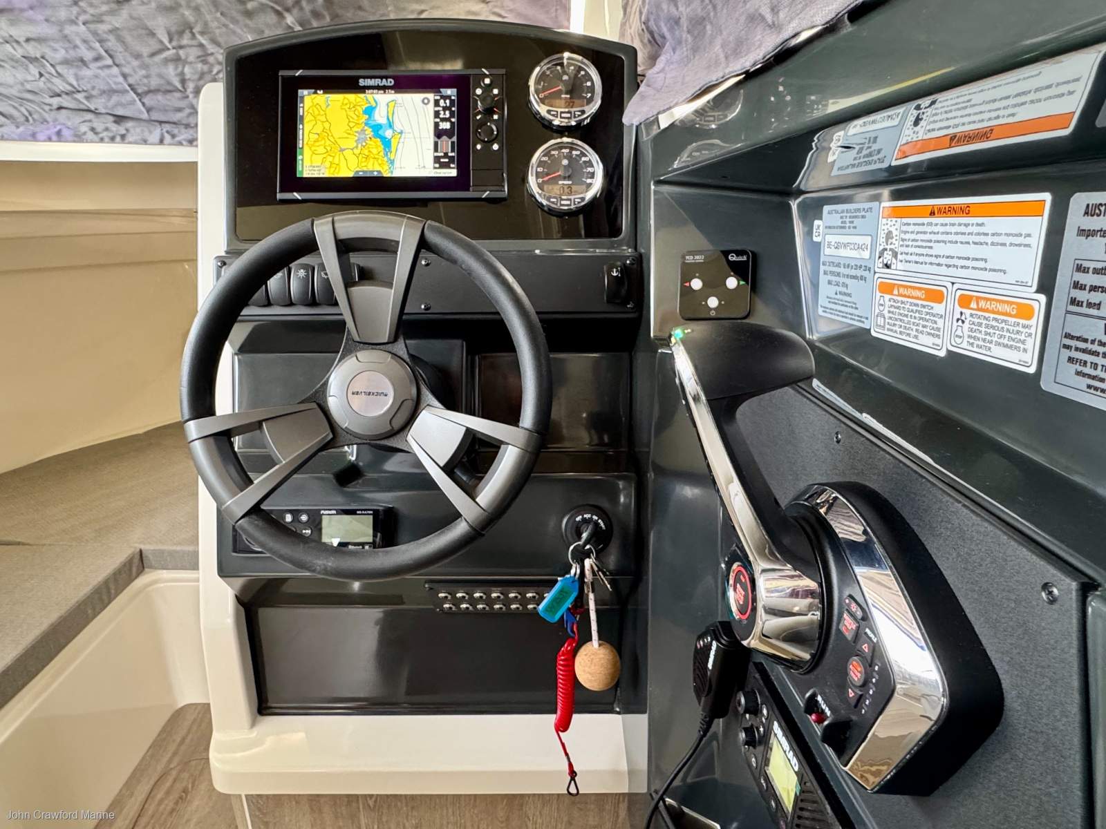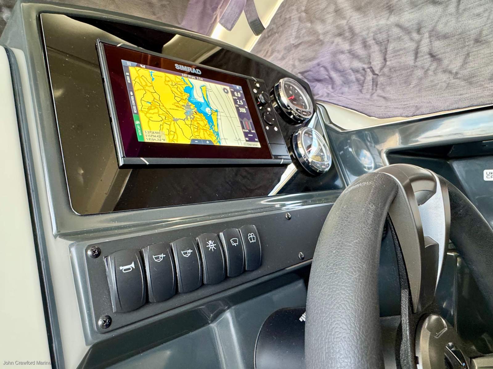 The helm position is very comfortable with excellent viewing all around and the engine controls are well-placed in a comfortable position as pictured. Option the boat with a colour 9" touch screen Simrad GPS/Plotter/Sounder unit for ease of navigation.