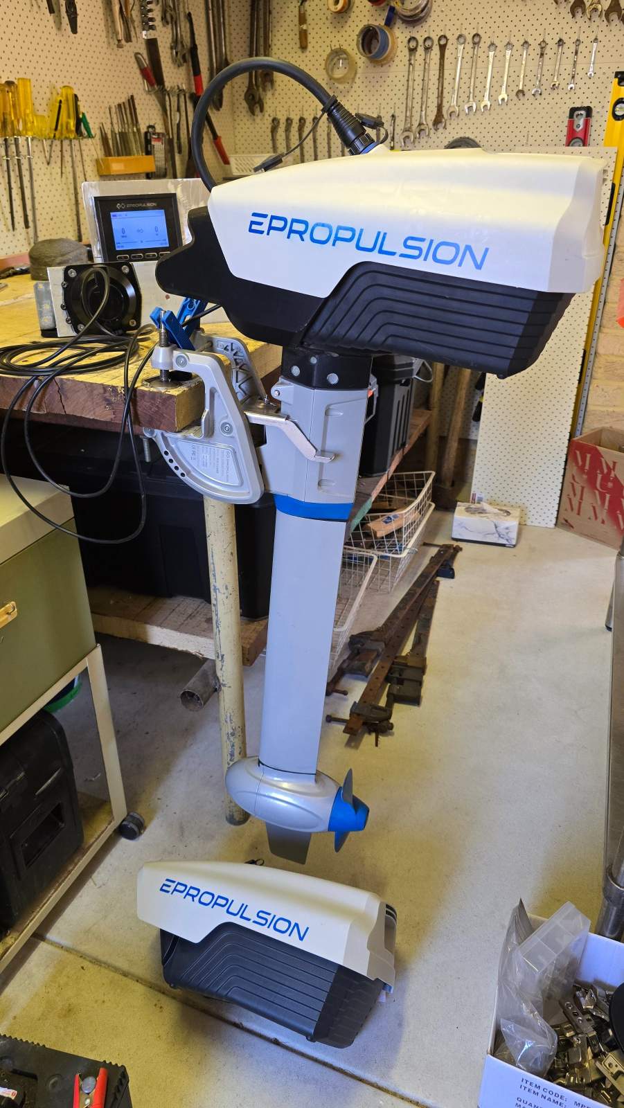 Very tidy ePropulsion Spirit 1.0 Evo - Short Shaft electric outboard, configured for remote steering and throttle control.