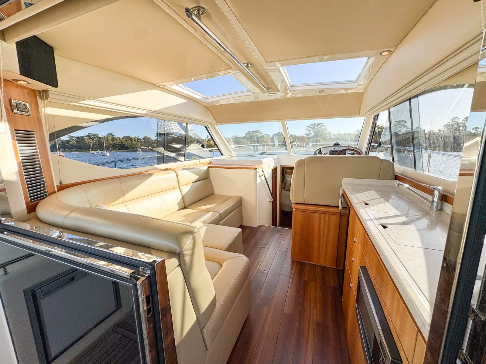 As you enter through the stainless steel saloon door, you are met with a large L-shaped lounge and a well-equipped galley featuring a fridge, stove, convection microwave and plenty of storage space. The panoramic sliding windows provide ample natural light and visibility, ensuring that you can enjoy the view in the comfort of a fully enclosed cabin when the weather gets nasty. Navigation is assisted by the 12" Raymarine MFD, but the real delight is just how easy this vessel is to dock thanks to the Volvo IPS joystick control!