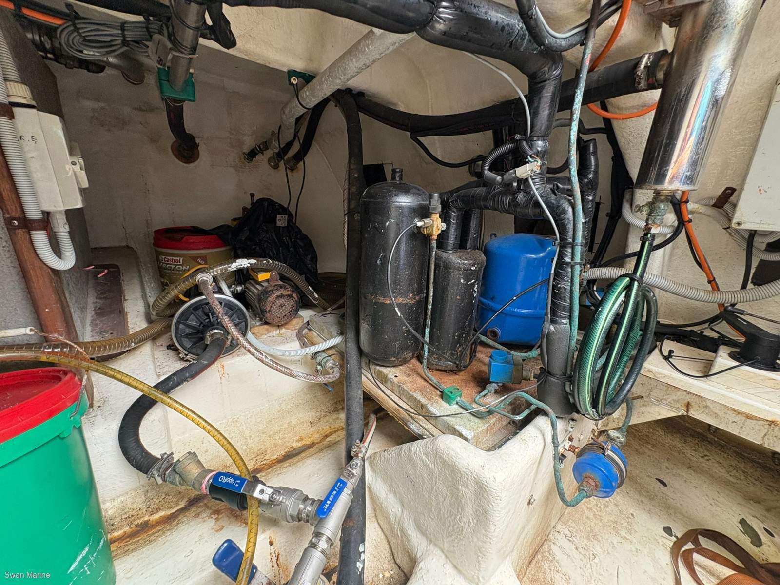 Marine refrigeration unit with under deck blast freezer and twin fridge/freezer units in transom locker - all recently overhauled and repaired.