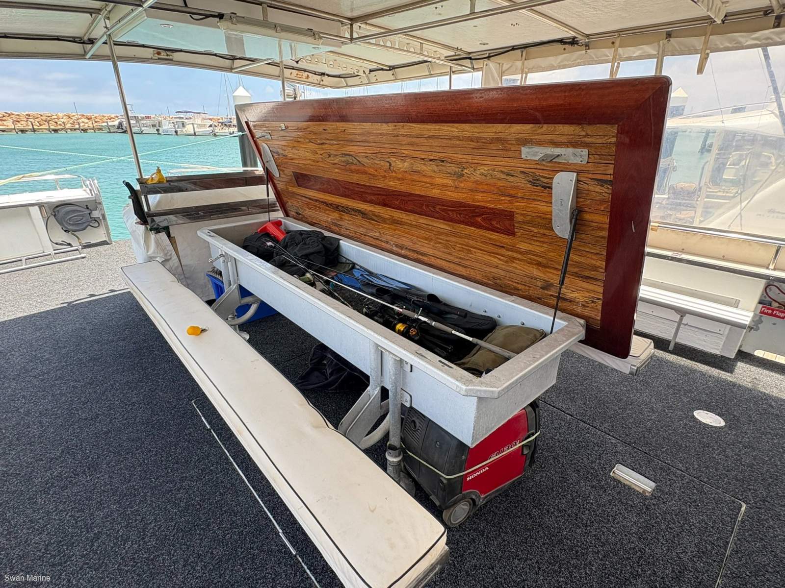 - New smart TV on aft deck which folds away into ceiling in custom storage