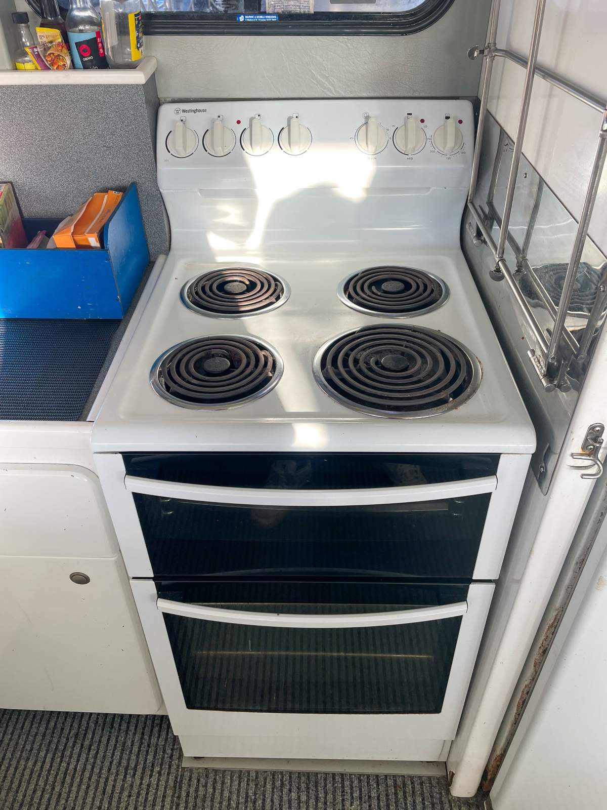Large well-equipped galley featuring domestic electric 4 burner cooktop, plus oven (Westinghouse)