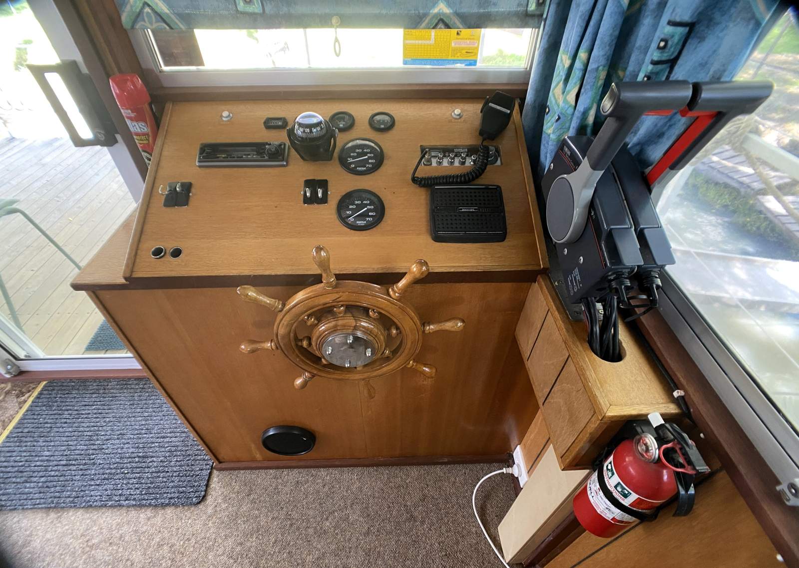 On entry, the starboard helm is fitted with standard instrumentation, a CD stereo, and UHF radio. Opposite the helm is a futon lounge that converts to a bed to accommodate additional guests. Aft is the dining area, with TV and DVD for entertainment. Large windows throughout the vessel allow for plenty of natural light.