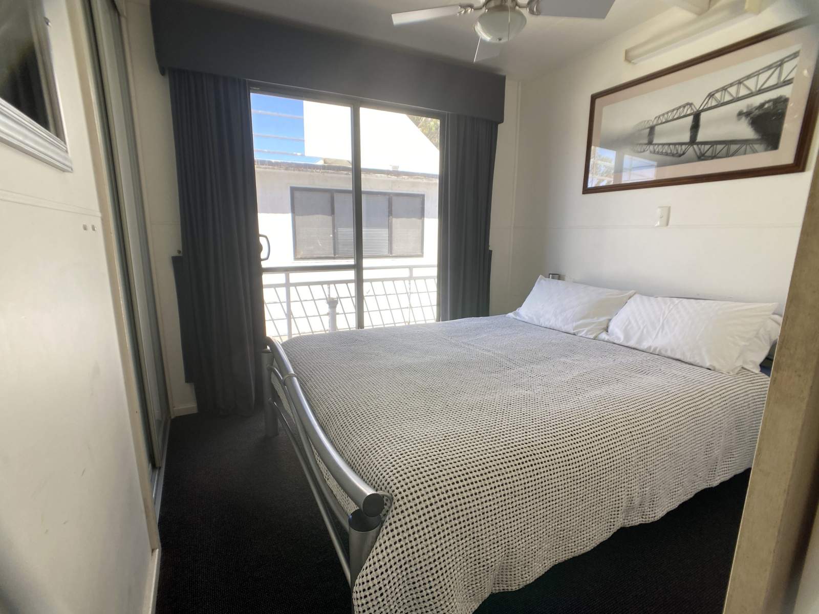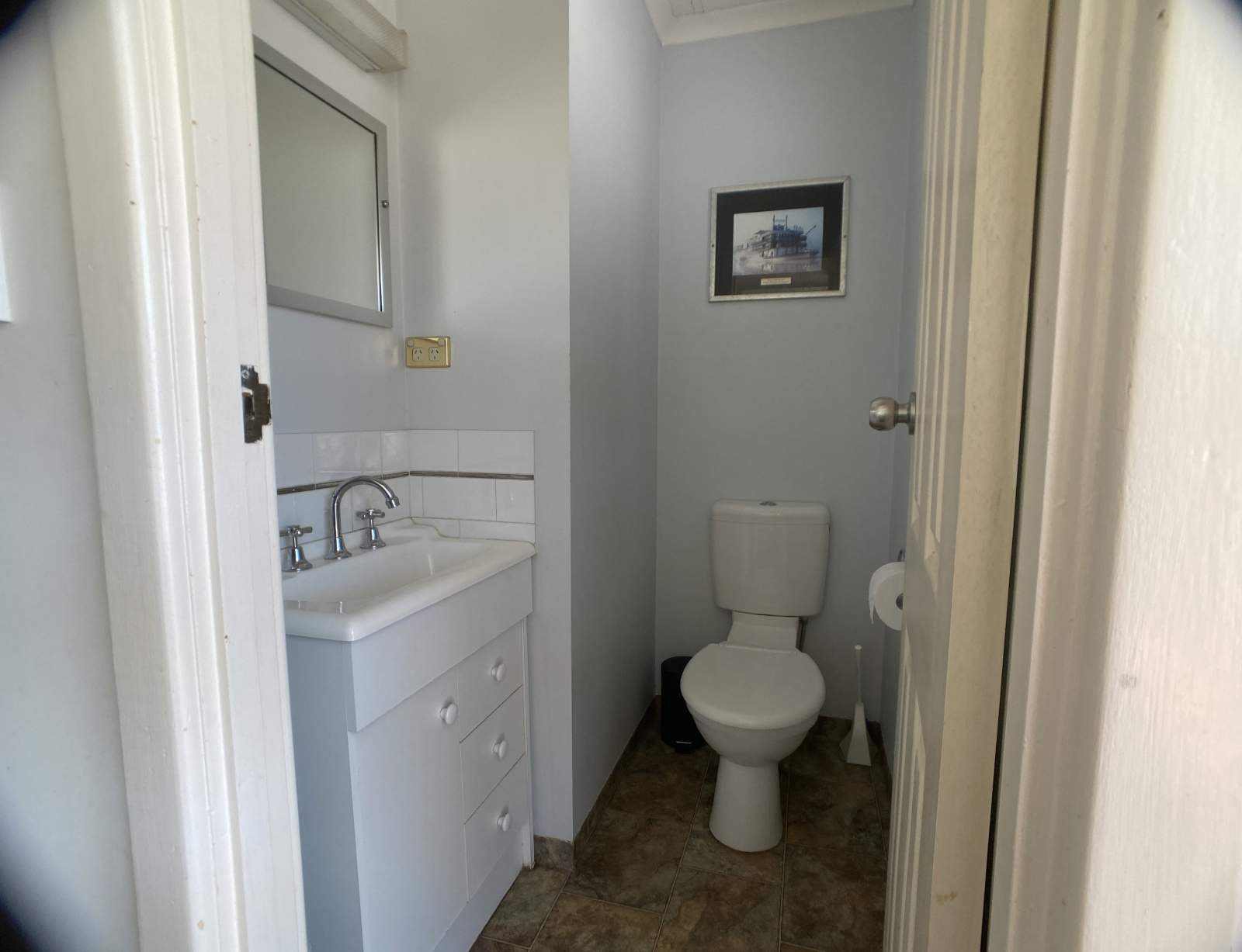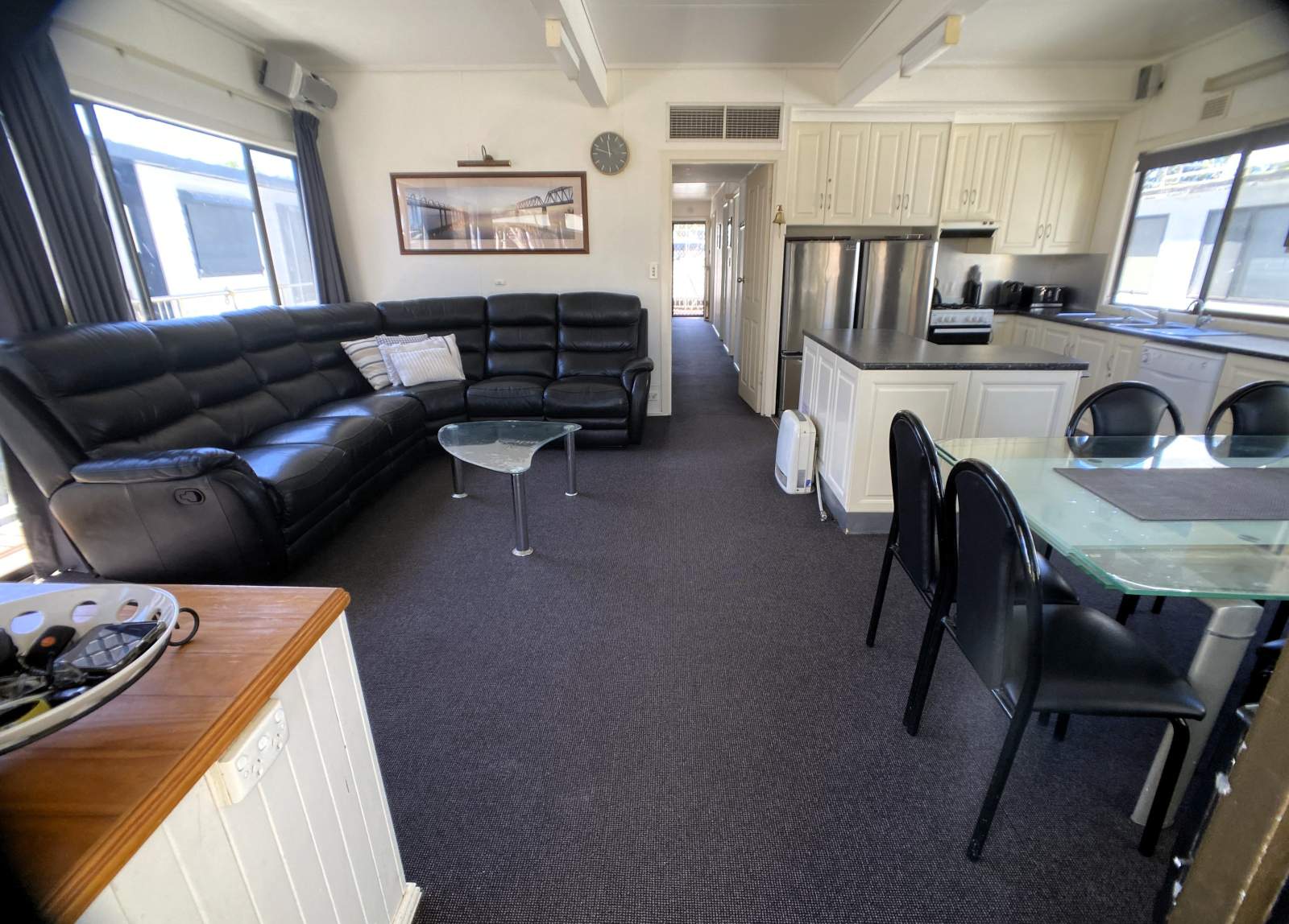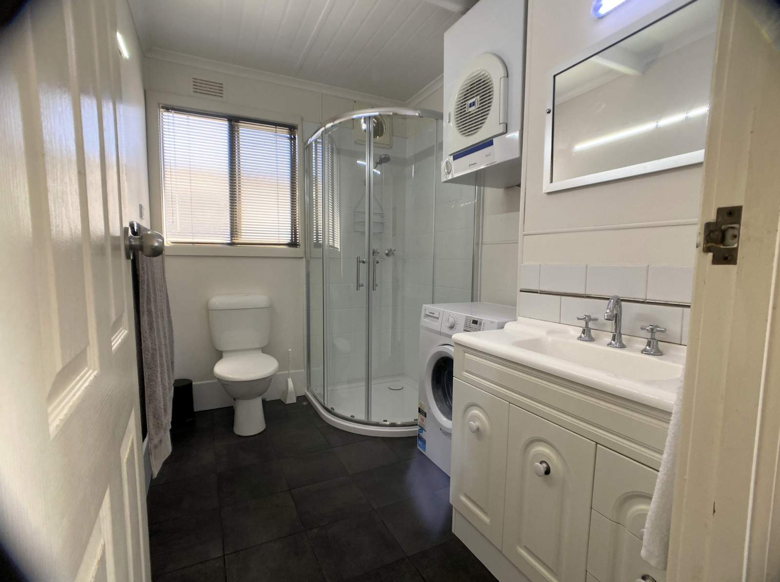 The main bathroom and laundry features a moulded corner glass shower, household flushing toilet, vanity storage and a Euromaid front-loading washing machine and dryer, while a second powder room includes a toilet and vanity for added convenience.