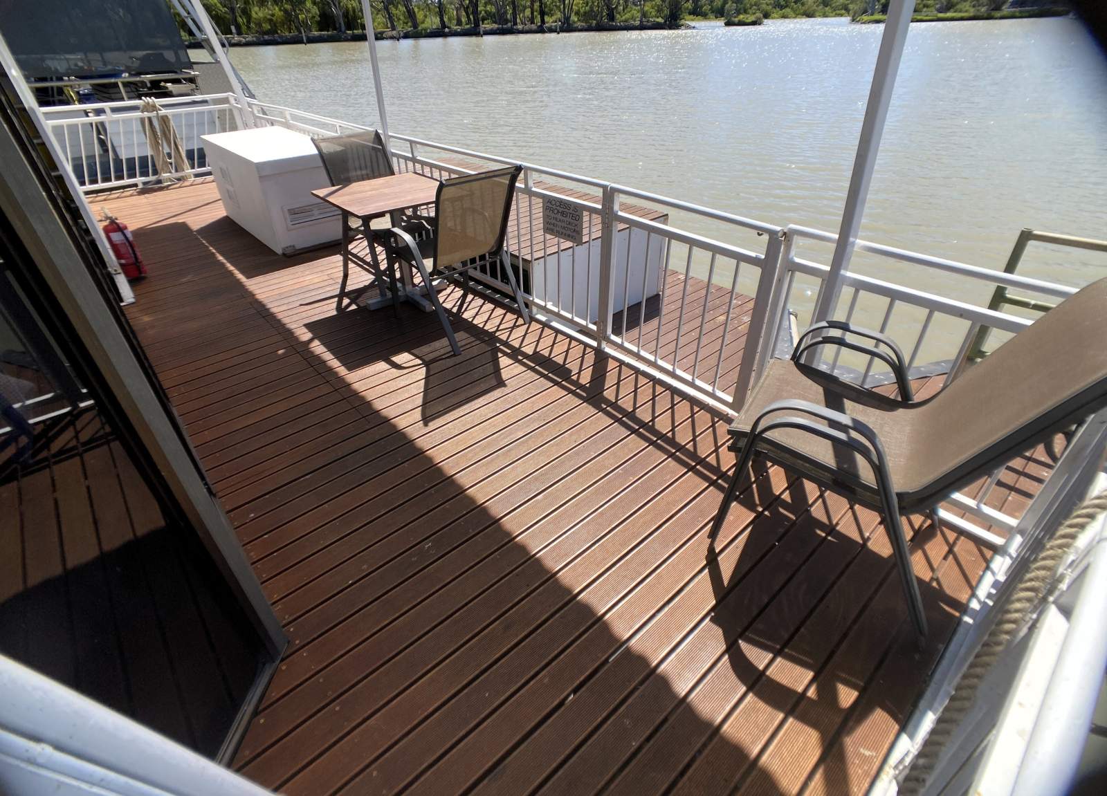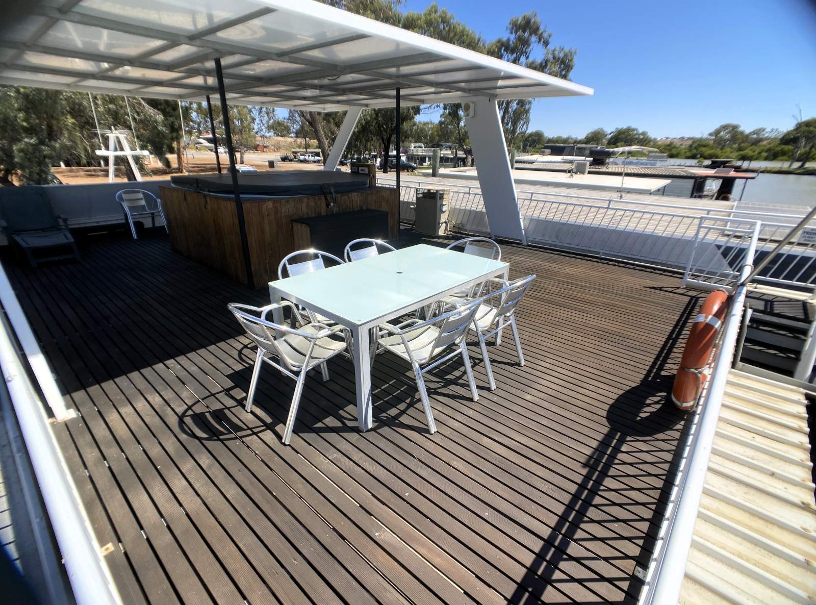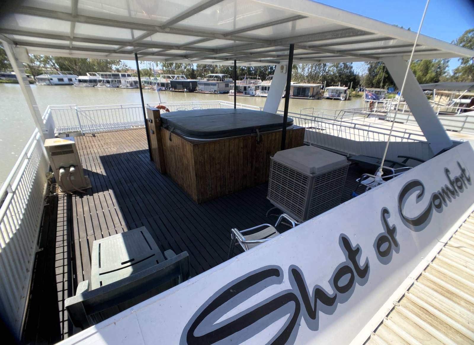 From the moment you arrive, the boat sets the tone for relaxed river living. A full-length forward boarding protection platform features a pull-out ramp, heavy-duty steel fencing, side gate entry and convenient pump-out points. Hardwood planking and a large shaded front deck create an inviting space for entertaining or simply soaking up the surroundings.