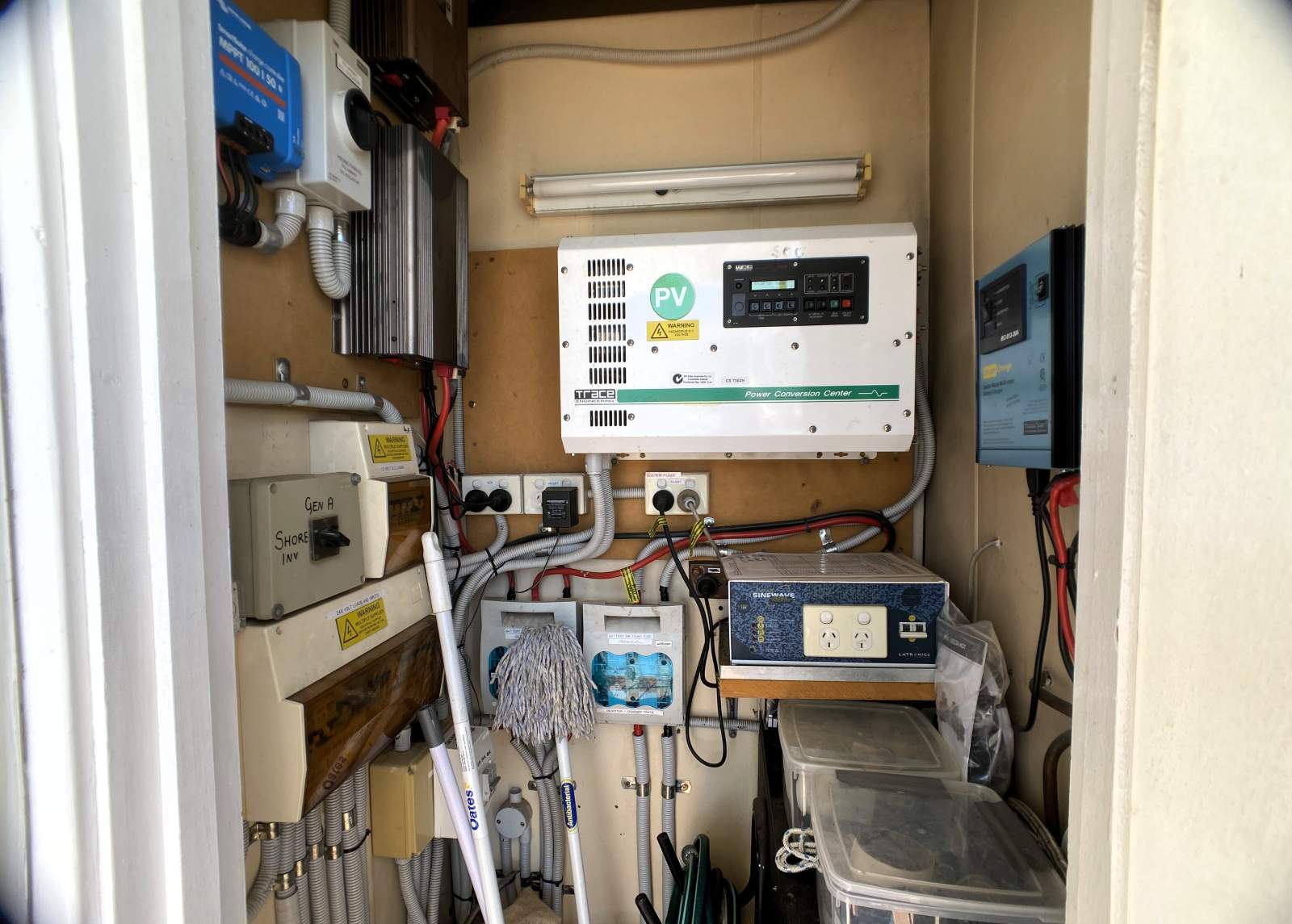 Power and self-sufficiency are standout features, with off-grid electrics including a Trace Engineering 4,500W inverter, four 2023 Sonenshein gel house batteries, Victron solar charging, eight solar panels and a remote-start Onan 11KVA diesel generator. The vessel is further supported by generous wastewater storage of 3,120 litres, freshwater capacity of 220 litres, EPA-compliant Storm Plastic filtration, and Rinnai Infinity instant gas hot water.