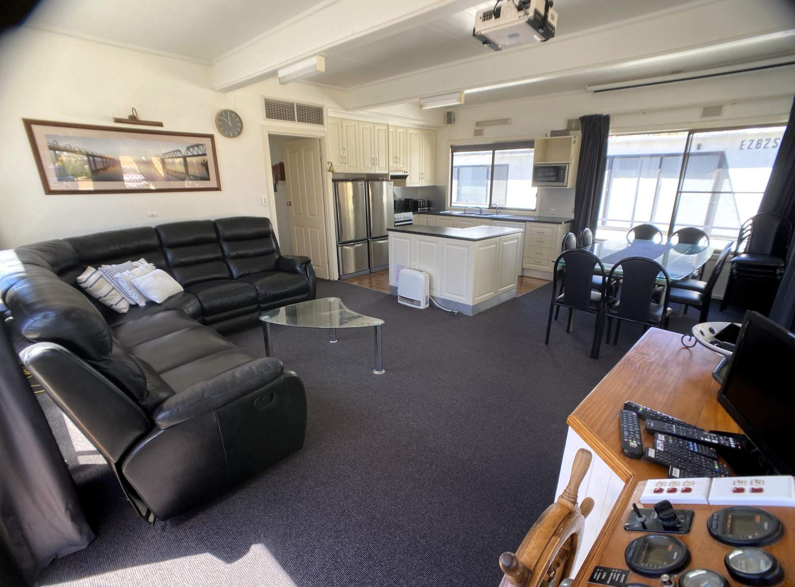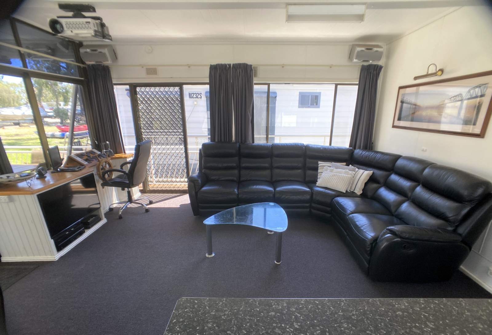 Inside, the forward living area is light-filled and elegant, enhanced by floor-to-ceiling glass that captures the river views. The starboard helm is fully equipped with Yamaha instrumentation, Hydrive hydraulic steering, Lowrance depth finder, GME UHF radio and a reverse camera, ensuring confident and comfortable cruising.