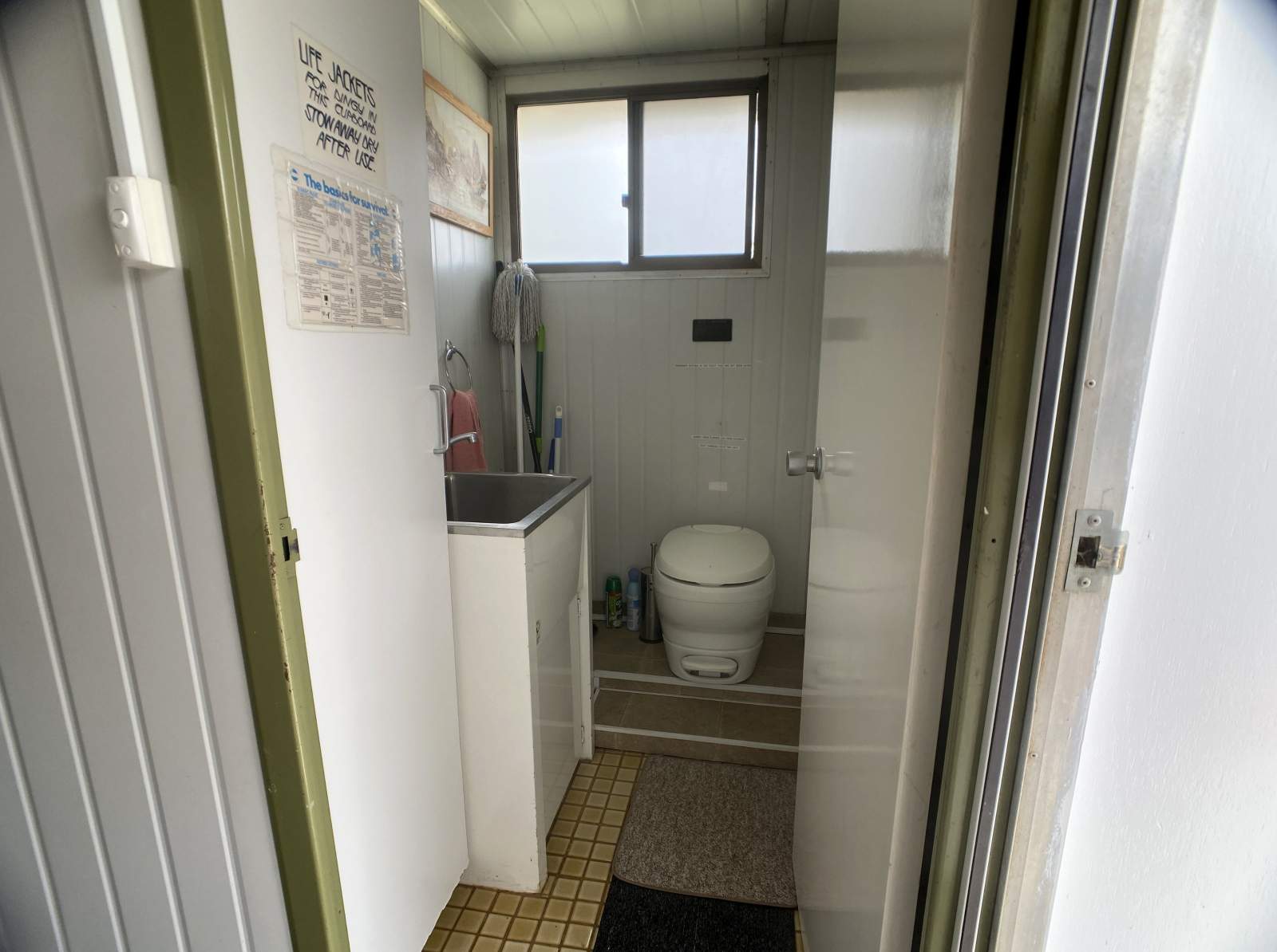 The mid-size bathroom includes a moulded shower and vanity, with a separate marine flush toilet conveniently located alongside.