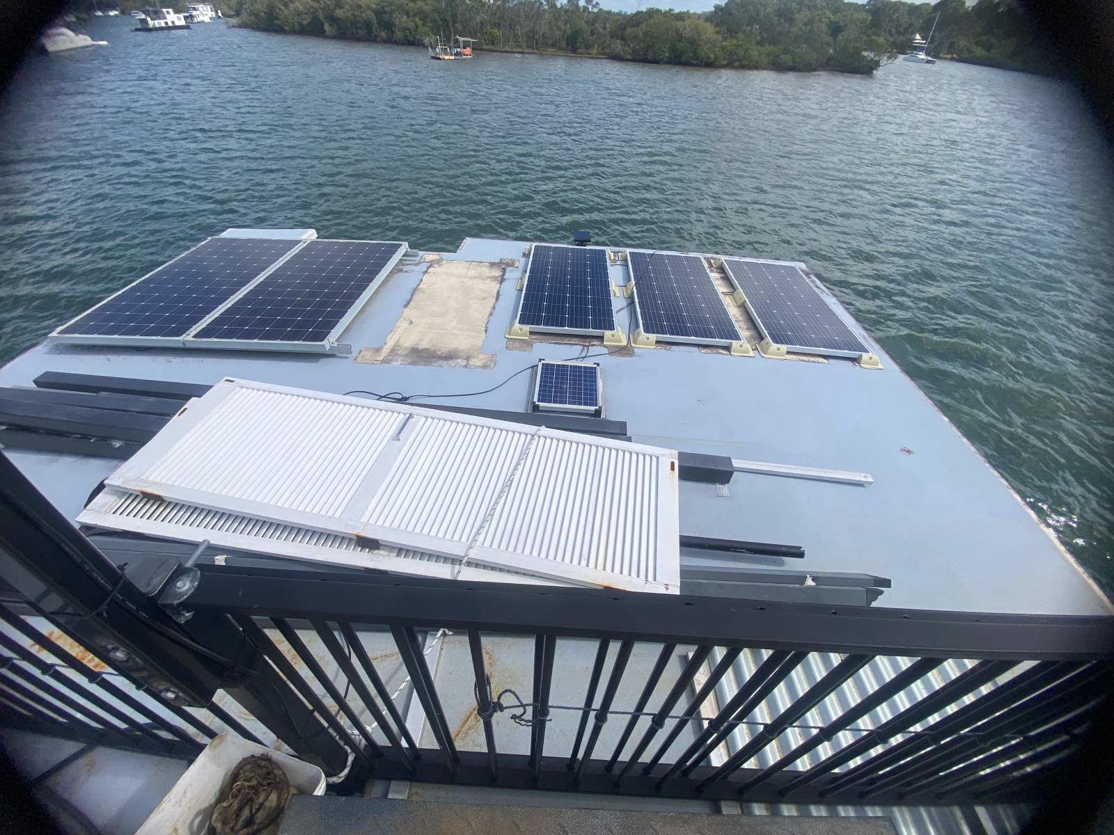 This boat has a double skin roof line that is slightly cambered for rain run off. It has been set up for rain collection via guttering and flows into either a toilet flush barrel or diverted into the fresh water tank underneath. The holding tank blk/fresh water is divided into 3000ltr blk, 2000ltr fresh. The boat is emptied at the local marina every 3.5mths, dependant on use, this cost is $40, where you can also refill for water.