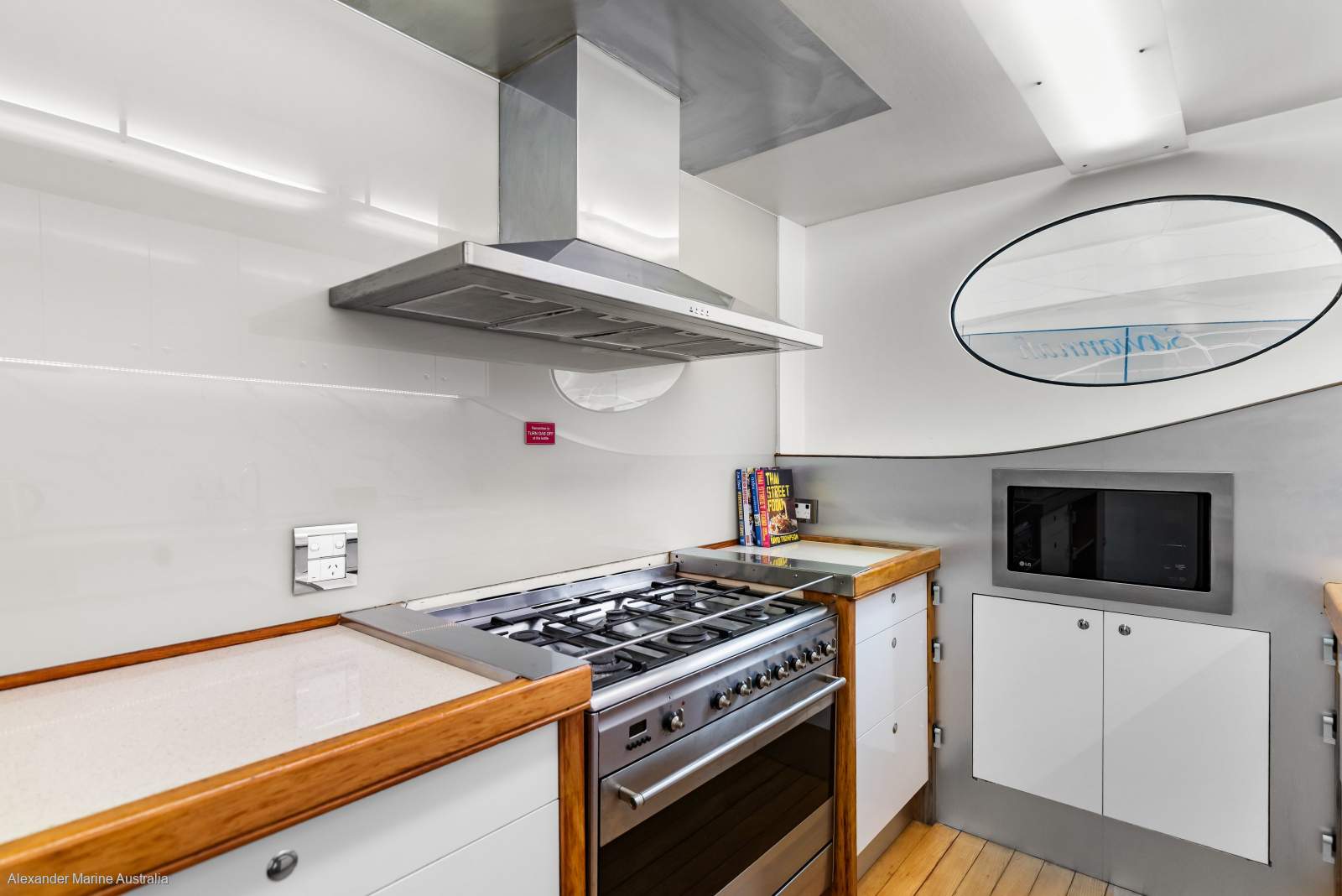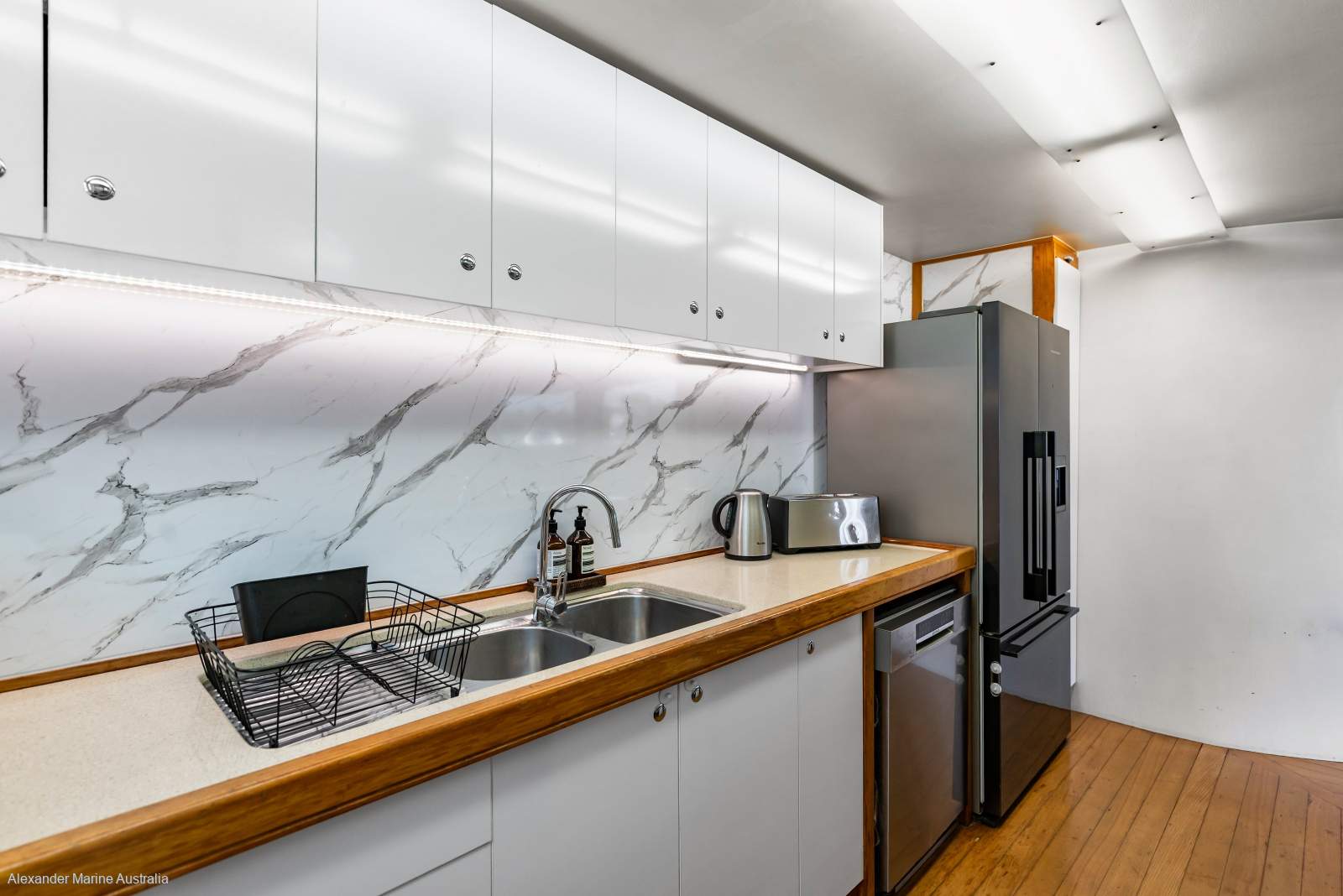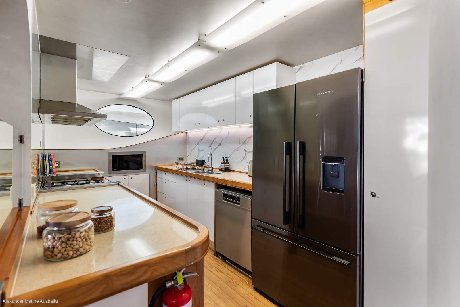 Main deck galley located to port featuring Fisher & Paykel French door 470L fridge/freezer, Smeg gas cooktop with oven, LG microwave, Bosch dishwasher,