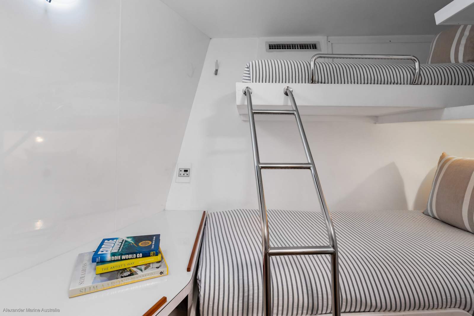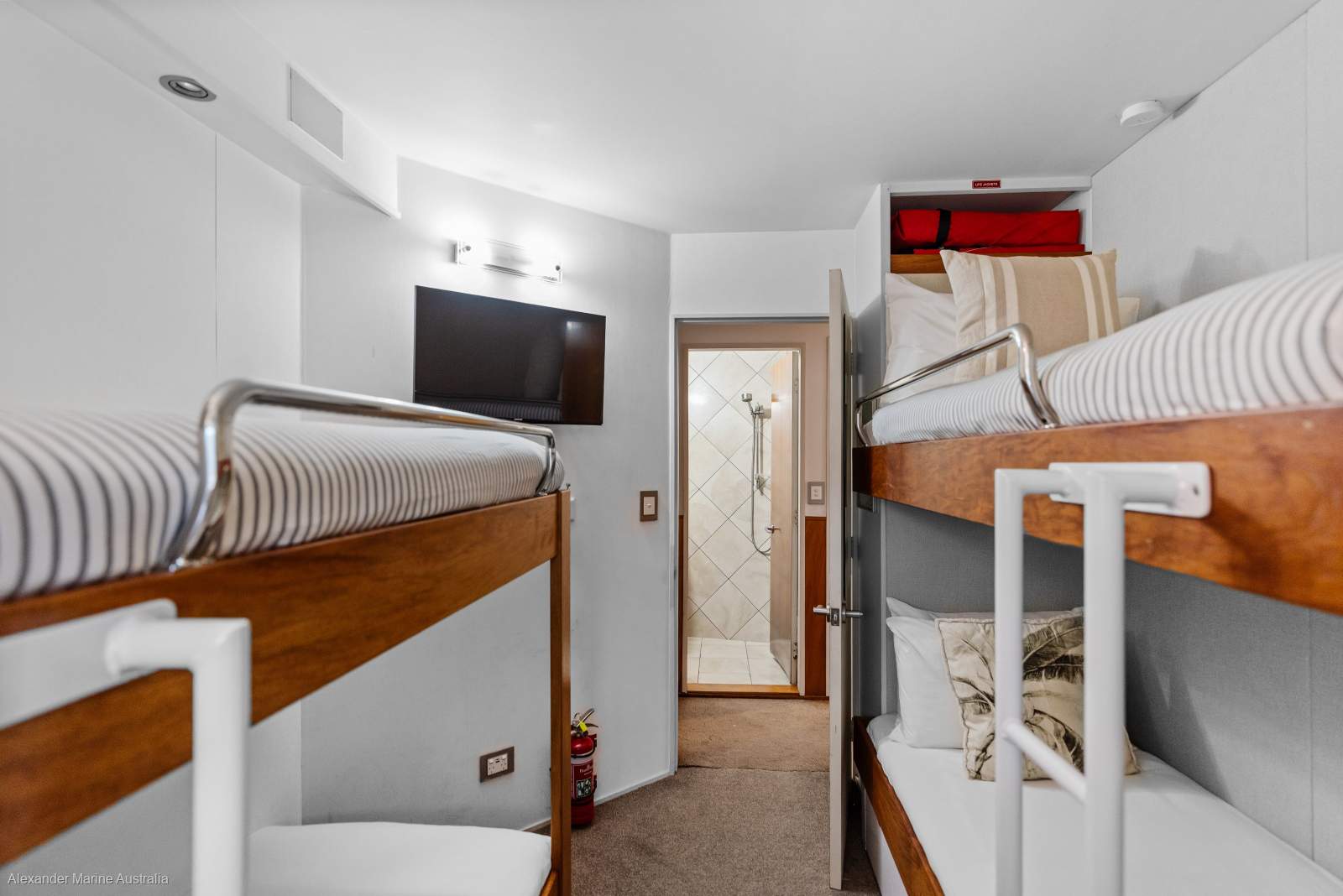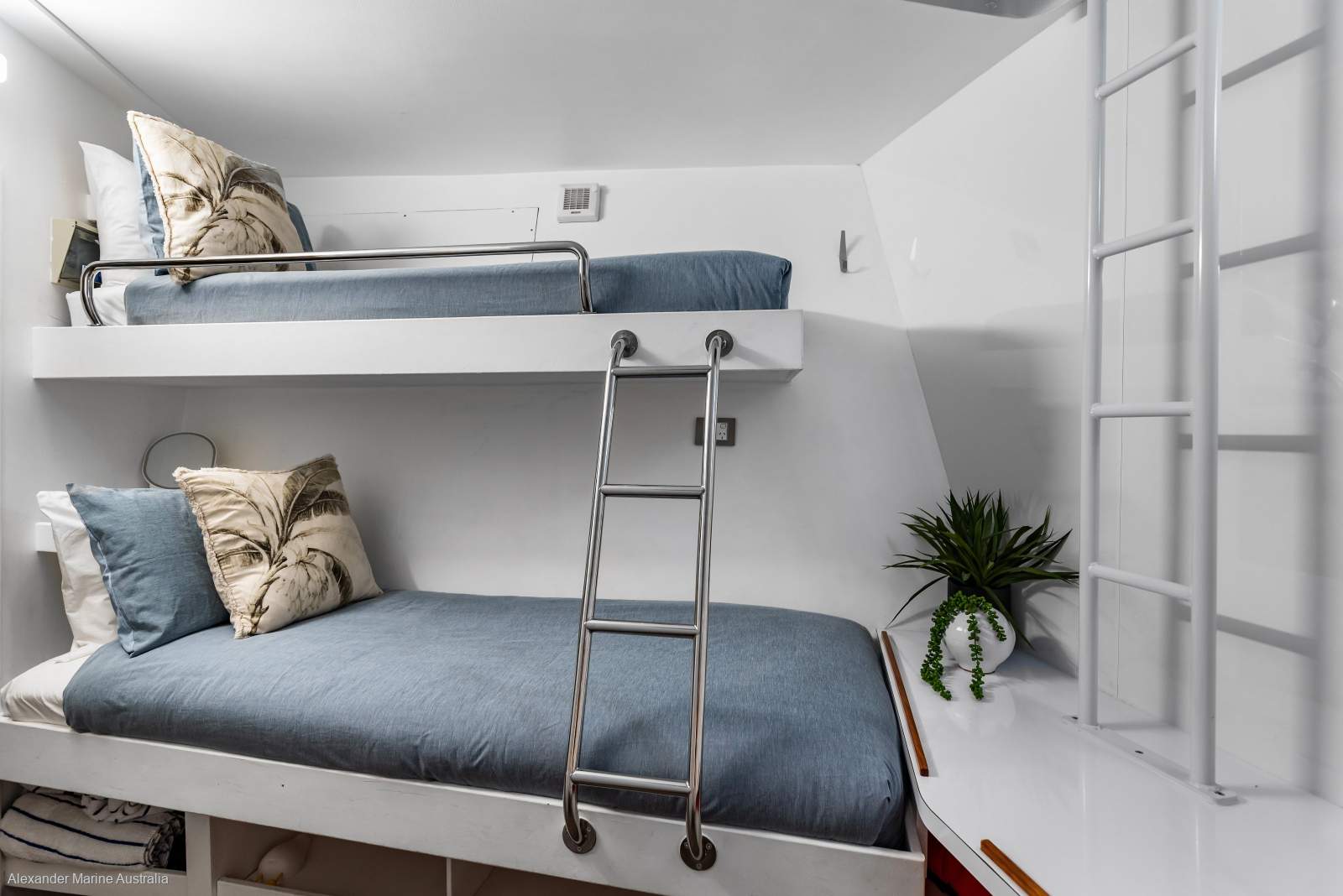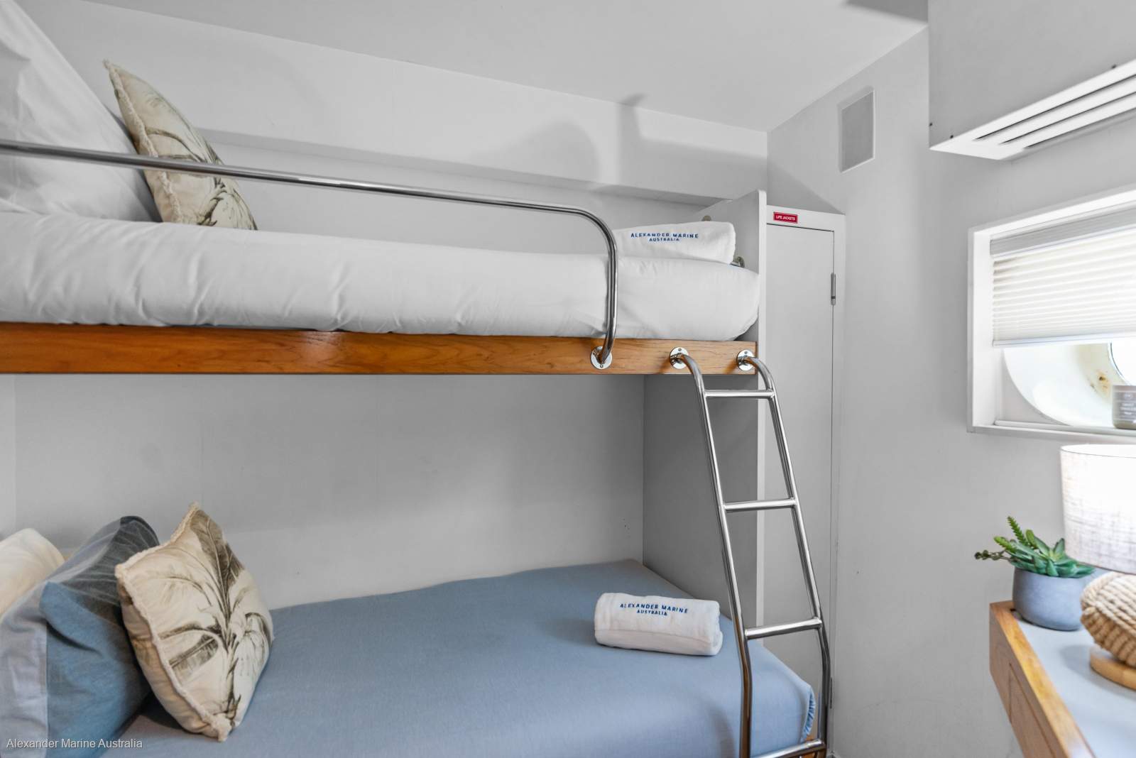Below deck, 'Savannah' offers four guest cabins plus an additional crew cabin, allowing accommodation for up to fourteen when needed. Two mirrored midship guest cabins to port and starboard each feature two single side-by-side beds athwartships, a 30" Samsung TV, and private ensuites. Forward, there are two bunk cabins, one with a single bunk and 30" Soniq TV, and the other with two bunks and 30" Samsung TV. The second crew cabin is forward on the same lower accommodation level, featuring two bunks and overhead hatch access up onto the bow, supporting operational efficiency. These cabins share a wet head with a separate toilet, suitable for family or younger guests. A laundry room with Fisher & Paykel washing machine and separate dryer provides practical support for extended cruising, ensuring both guest and crew needs are met.