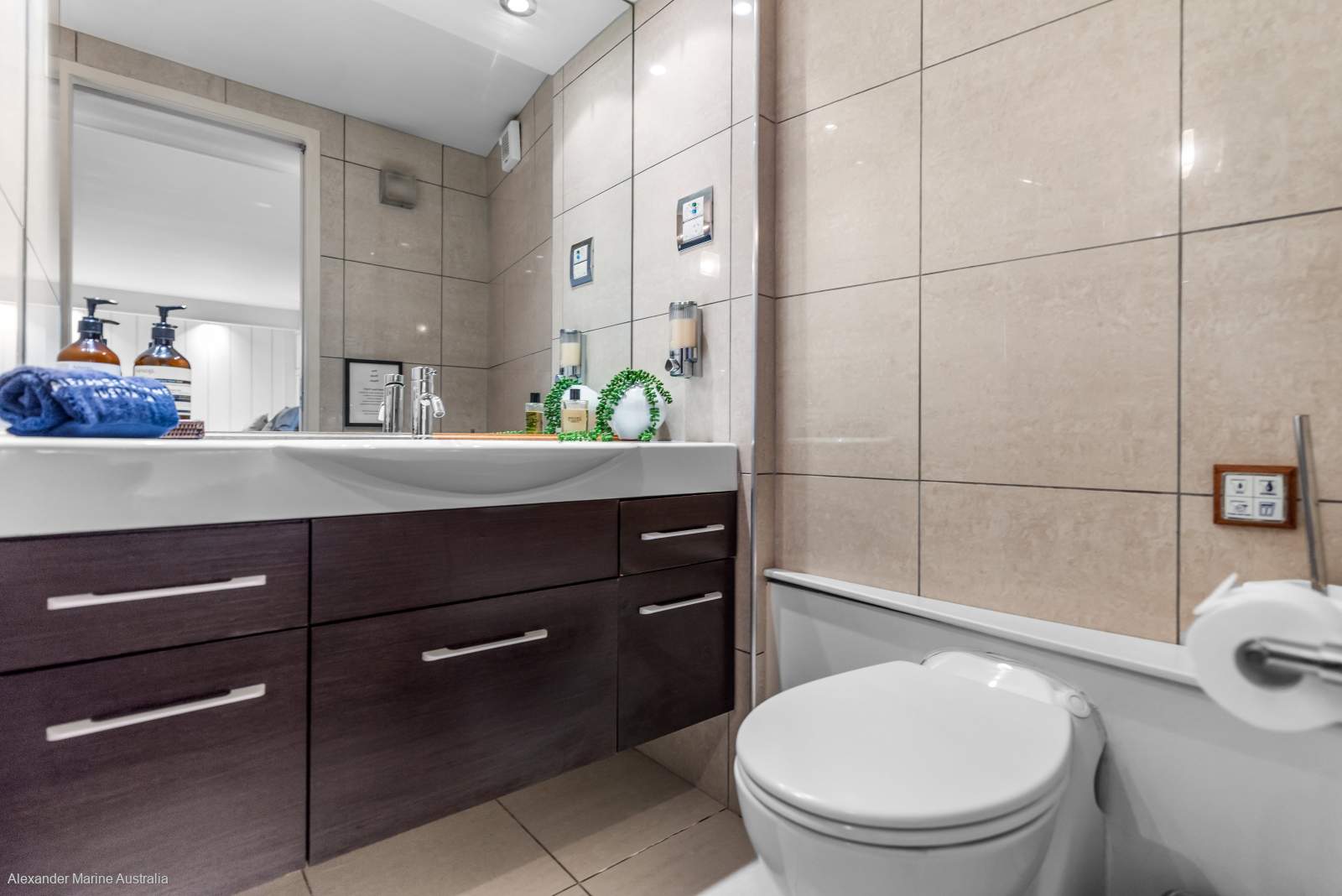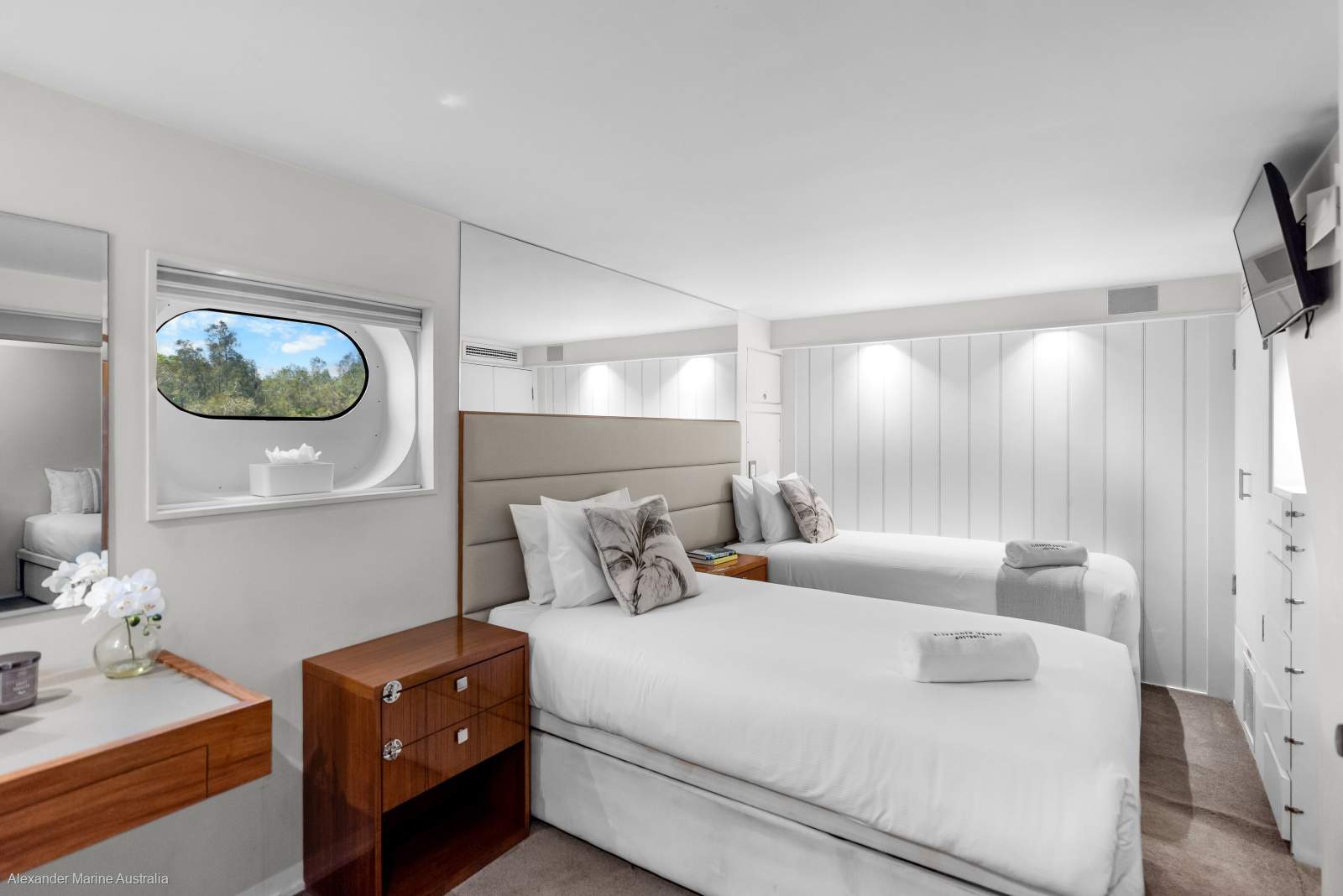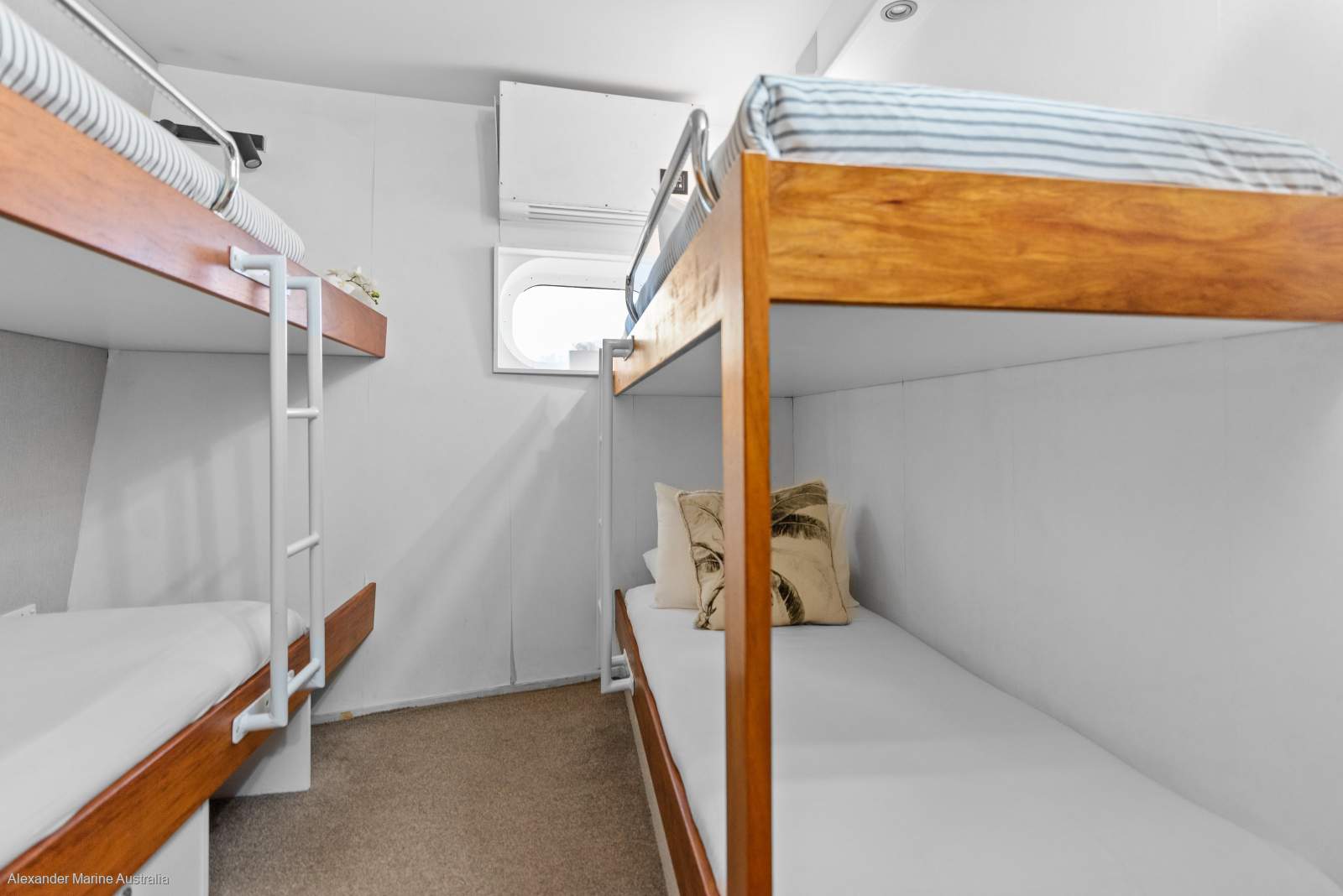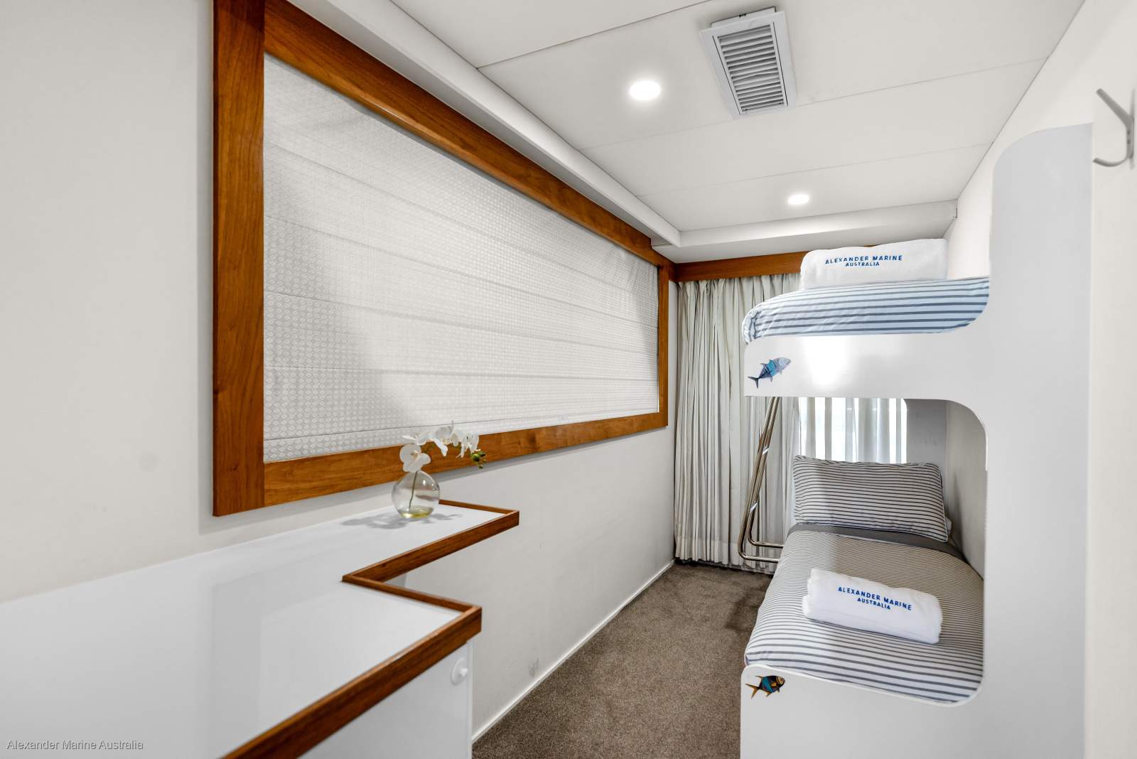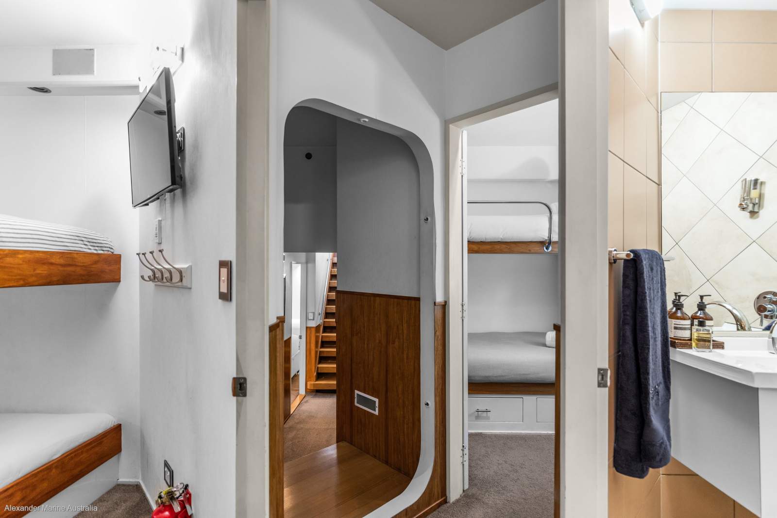 Below deck, 'Savannah' offers four guest cabins plus an additional crew cabin, allowing accommodation for up to fourteen when needed. Two mirrored midship guest cabins to port and starboard each feature two single side-by-side beds athwartships, a 30" Samsung TV, and private ensuites. Forward, there are two bunk cabins, one with a single bunk and 30" Soniq TV, and the other with two bunks and 30" Samsung TV. The second crew cabin is forward on the same lower accommodation level, featuring two bunks and overhead hatch access up onto the bow, supporting operational efficiency. These cabins share a wet head with a separate toilet, suitable for family or younger guests. A laundry room with Fisher & Paykel washing machine and separate dryer provides practical support for extended cruising, ensuring both guest and crew needs are met.