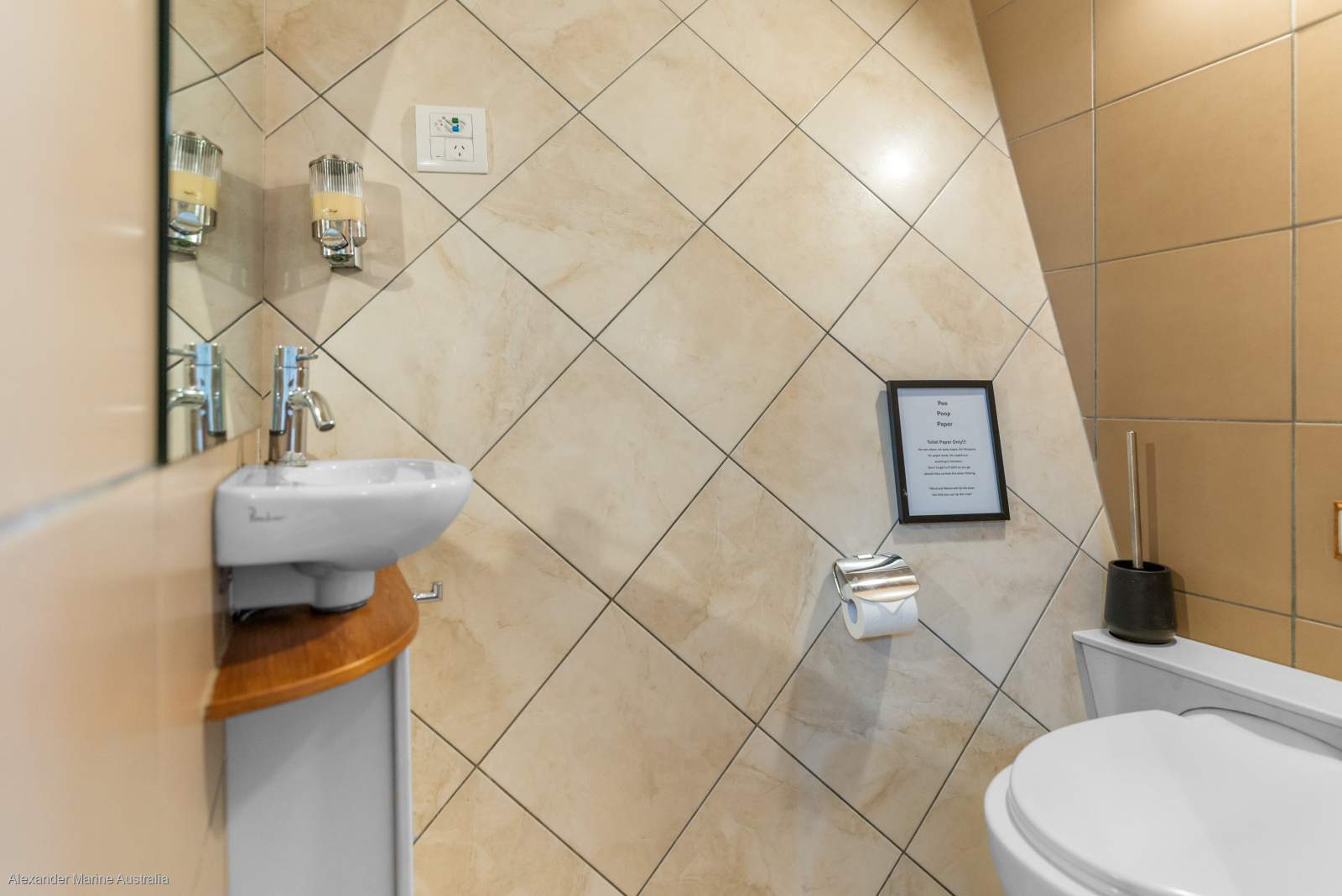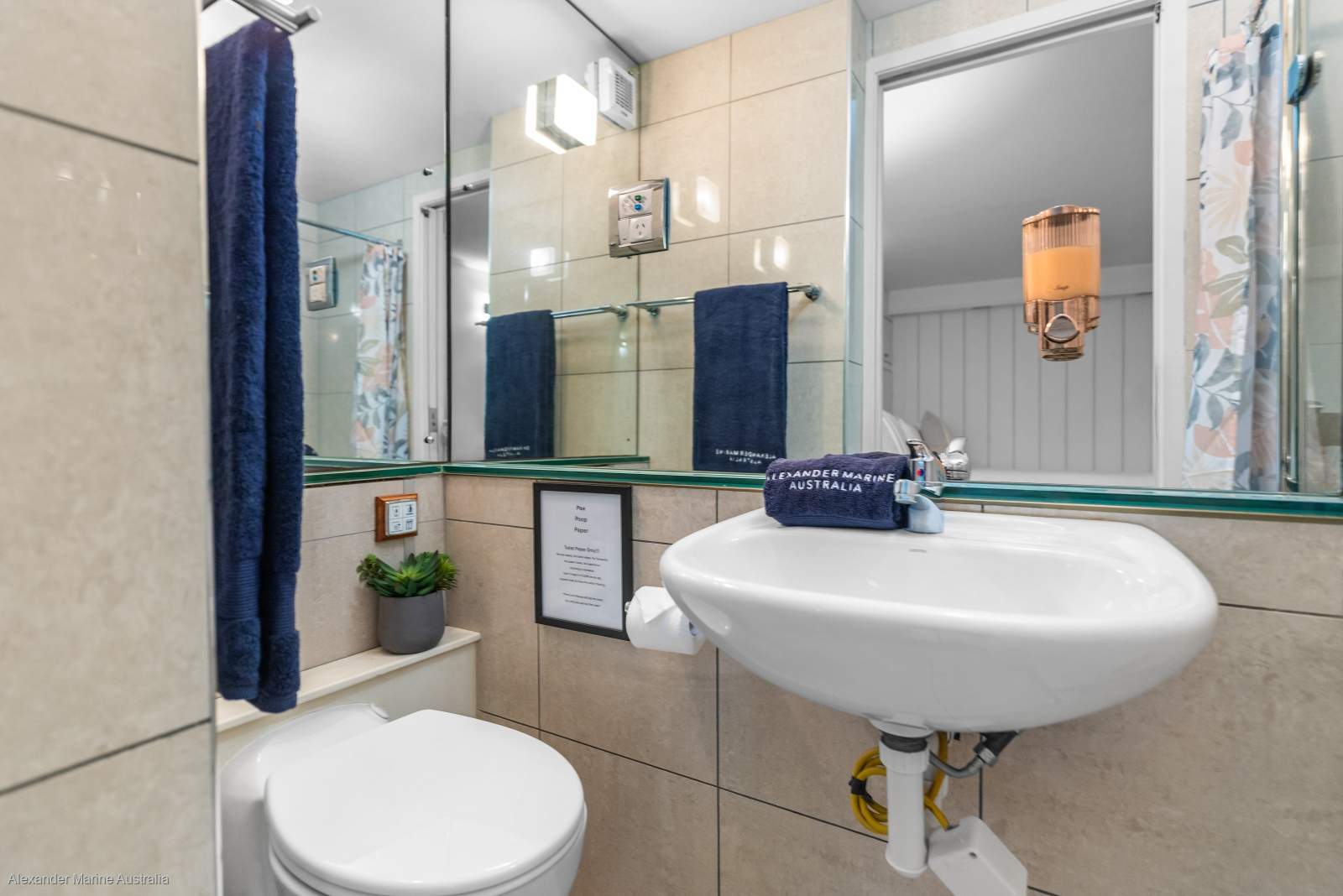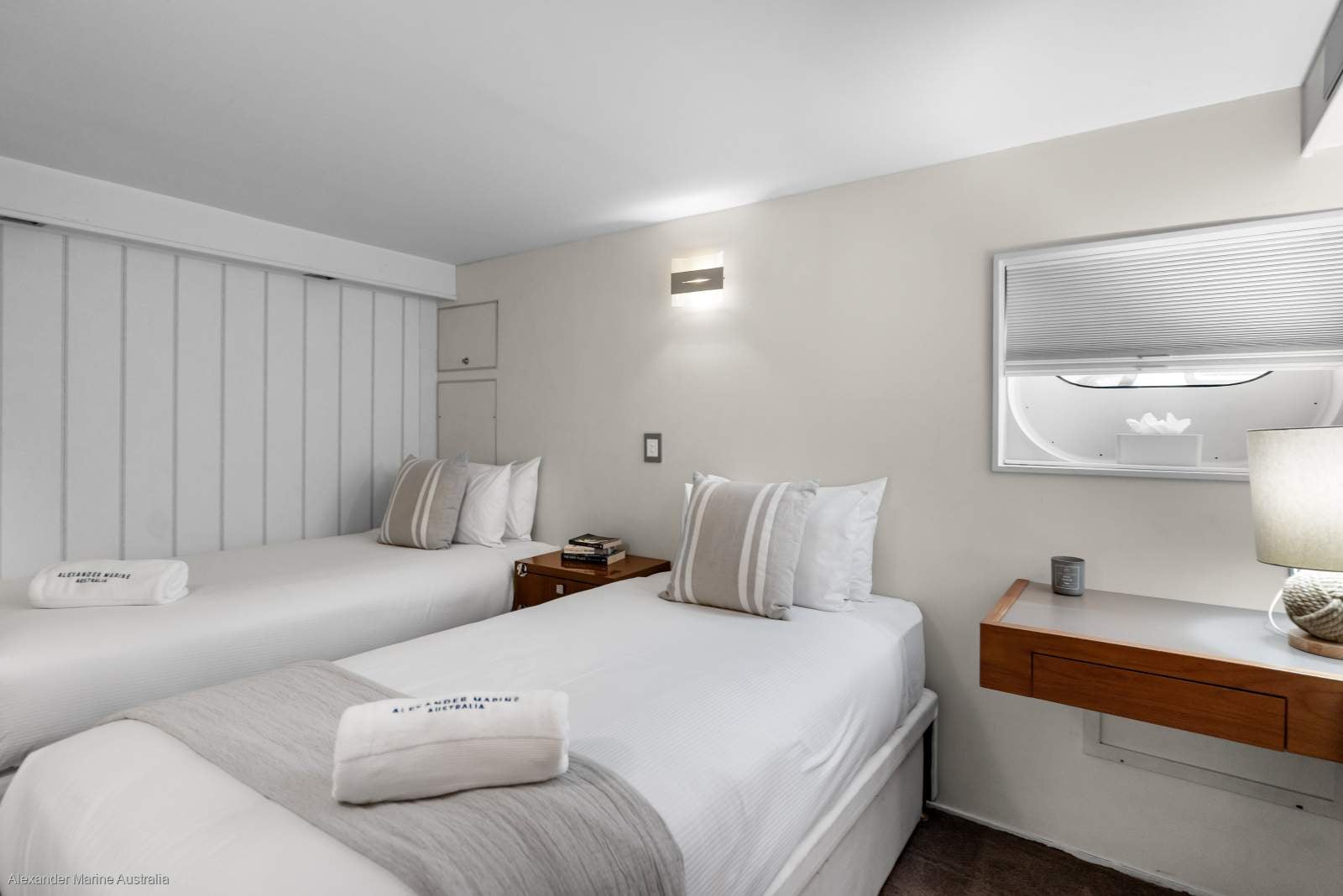 Four guest cabin + two crew accommodation layout. Two double guest cabins to port and starboard each with a private ensuite. Forward are two guest bunk cabins, with one featuring a single bunk, and the other featuring two bunks. An additional crew cabin featuring two bunks. Shared bathroom to port with a wet head and seperate toilet. Captain's cabin on the skylounge level featuring a single bunk.
