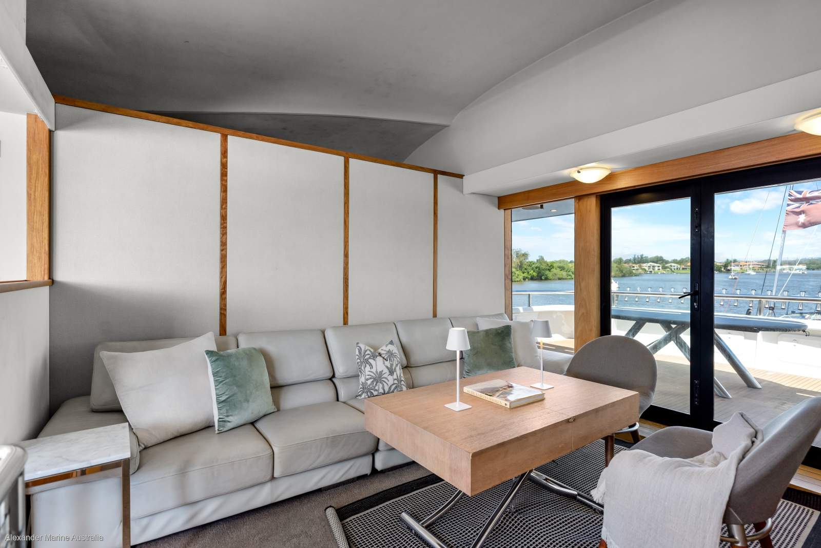 Accessible via internal stairs or from the cockpit, the skylounge provides an elevated space for relaxation, observation, and social activity. Inside, a Bose 535 Home Theatre System and a hi/lo 65" Samsung TV offer media options, complemented by a large sofa for casual seating. Stepping outside, the aft elevated boat deck features an oval table for alfresco meals and 25 rod holders for sport or recreational fishing. The helm station is equipped with a single helm chair and a guest navigator seat to port, offering functional space for passage management. Pilothouse doors to port and starboard allow quick access to deck areas, while allowing for excellent natural ventilation. Navigation and monitoring are handled via a Simrad electronics suite. Directly behind the helm to starboard is the captain's cabin, featuring single bunks and a Simrad MFD repeater, allowing the captain to monitor vessel systems closely during operations.